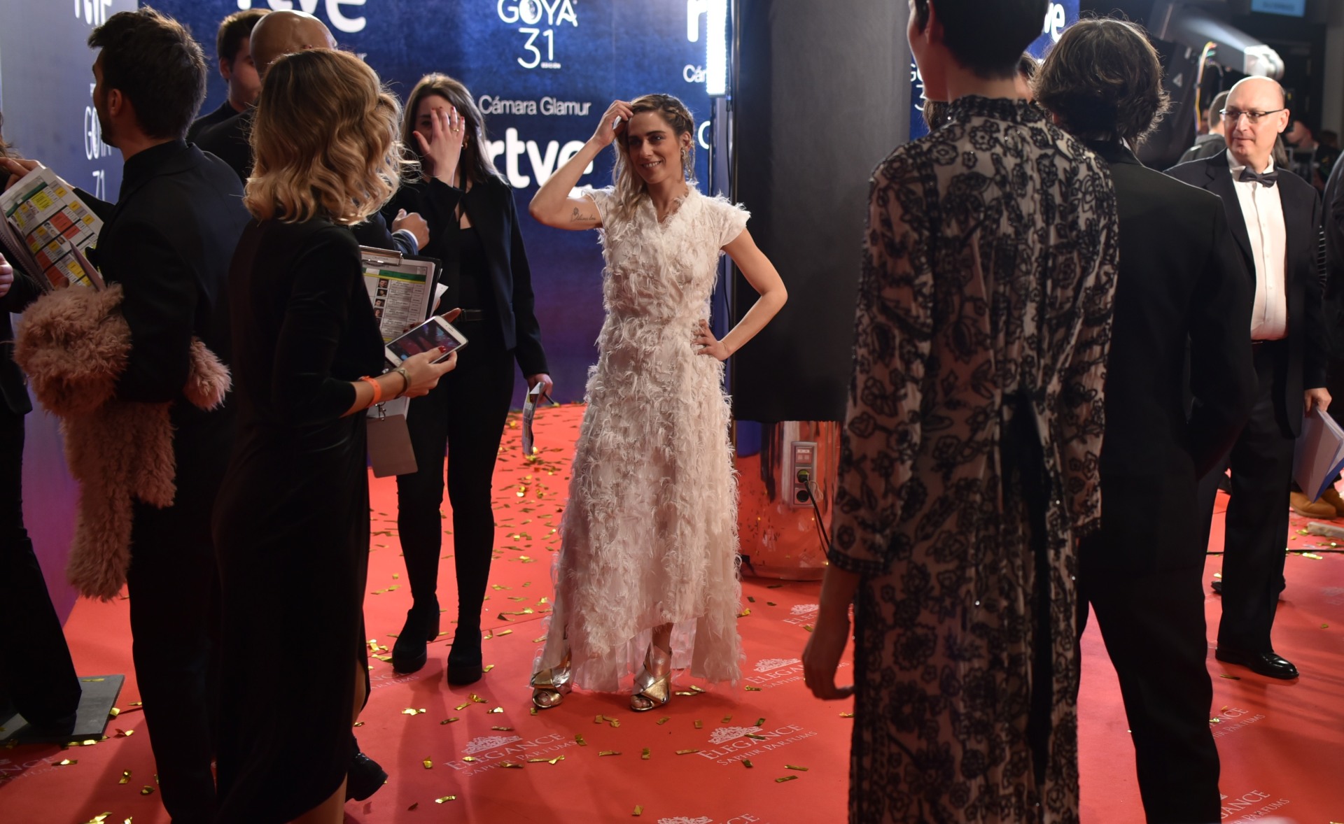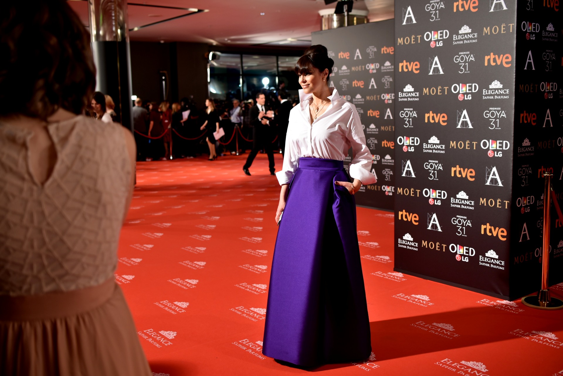 La actriz María Botto recibe instrucciones de miembros de protocolo de los Premios Goya.