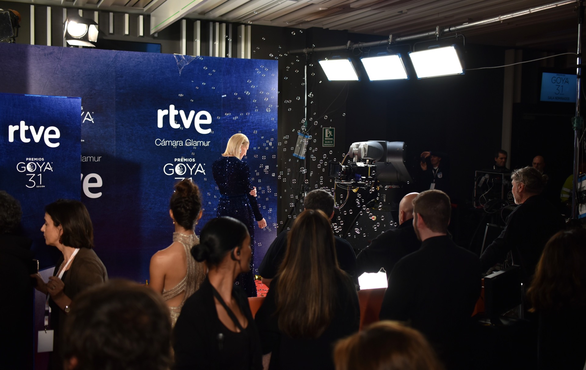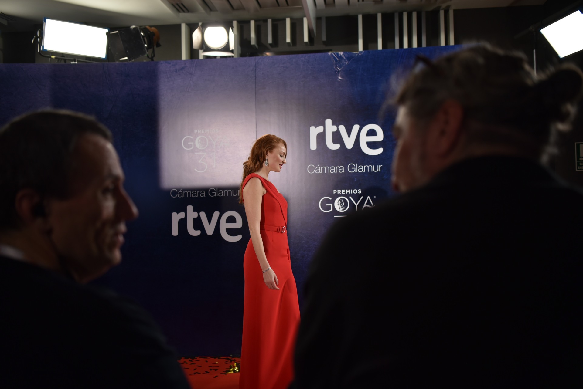 Dos técnicos de Televisión Española conversan mientras la actriz Cristina Castaño se prepara para su intervención en el set de la cadena en la alfombra de los Goya.