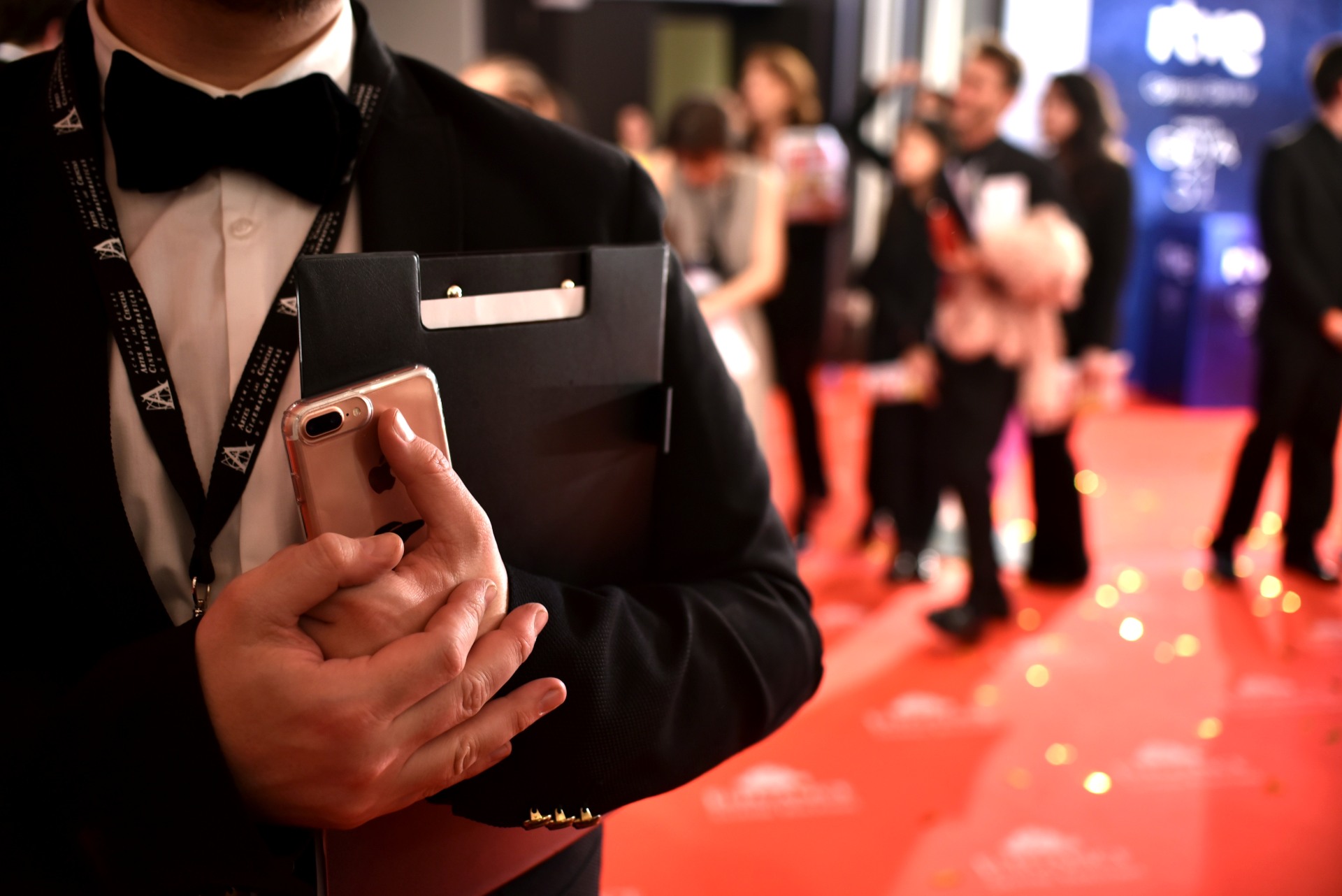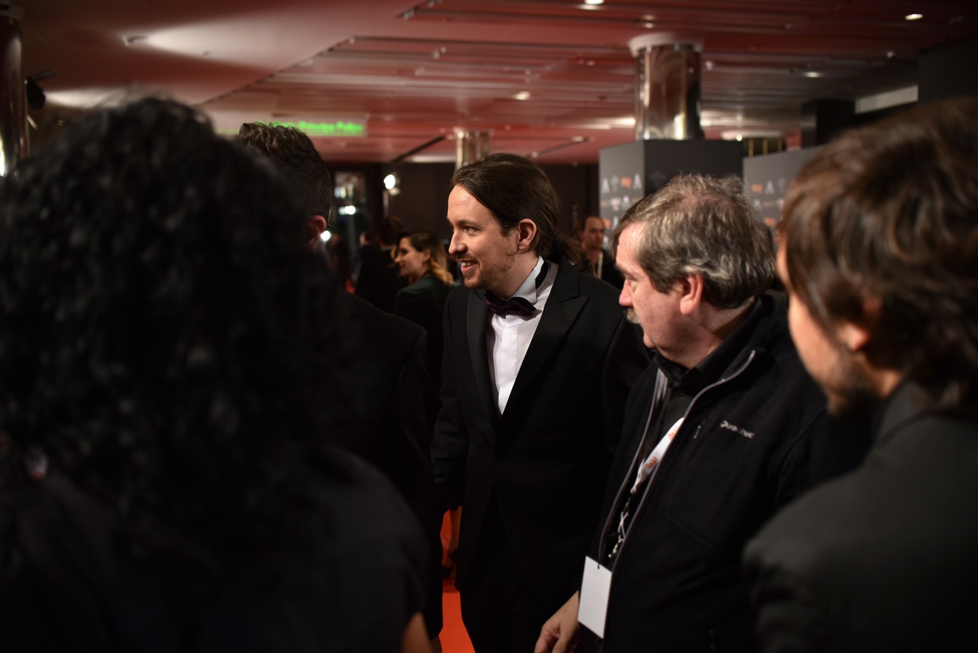 Dos chicas de la organización revisando el listado de invitados en un rincón de la alfombra roja. El actor Emilio Palacios (Los héroes del mal, Rumbos...) luciendo un llamativo peinado.