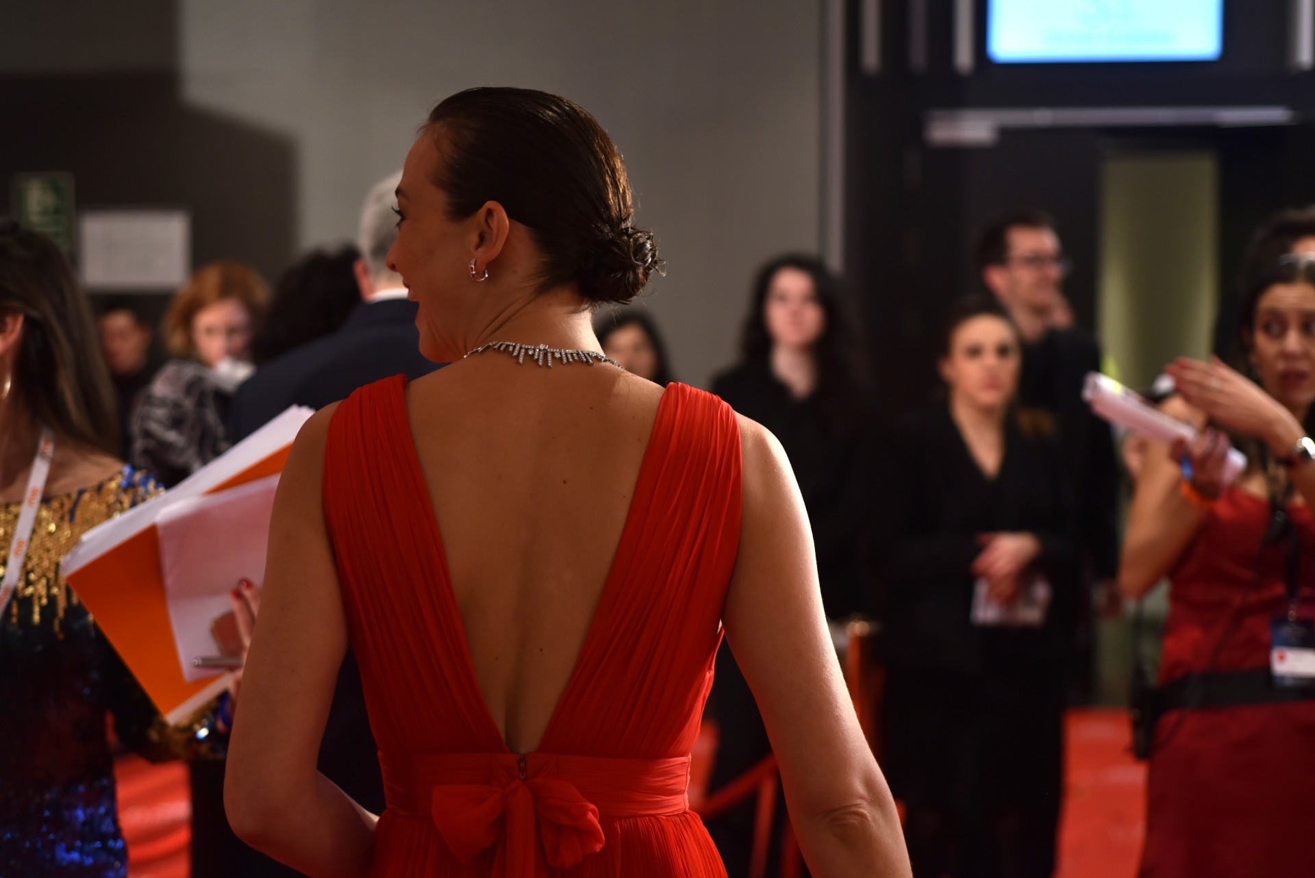 Un momento de la alfombra roja, minutos antes de comenzar la gala, en el que María León se toma un respiro después del photocall.