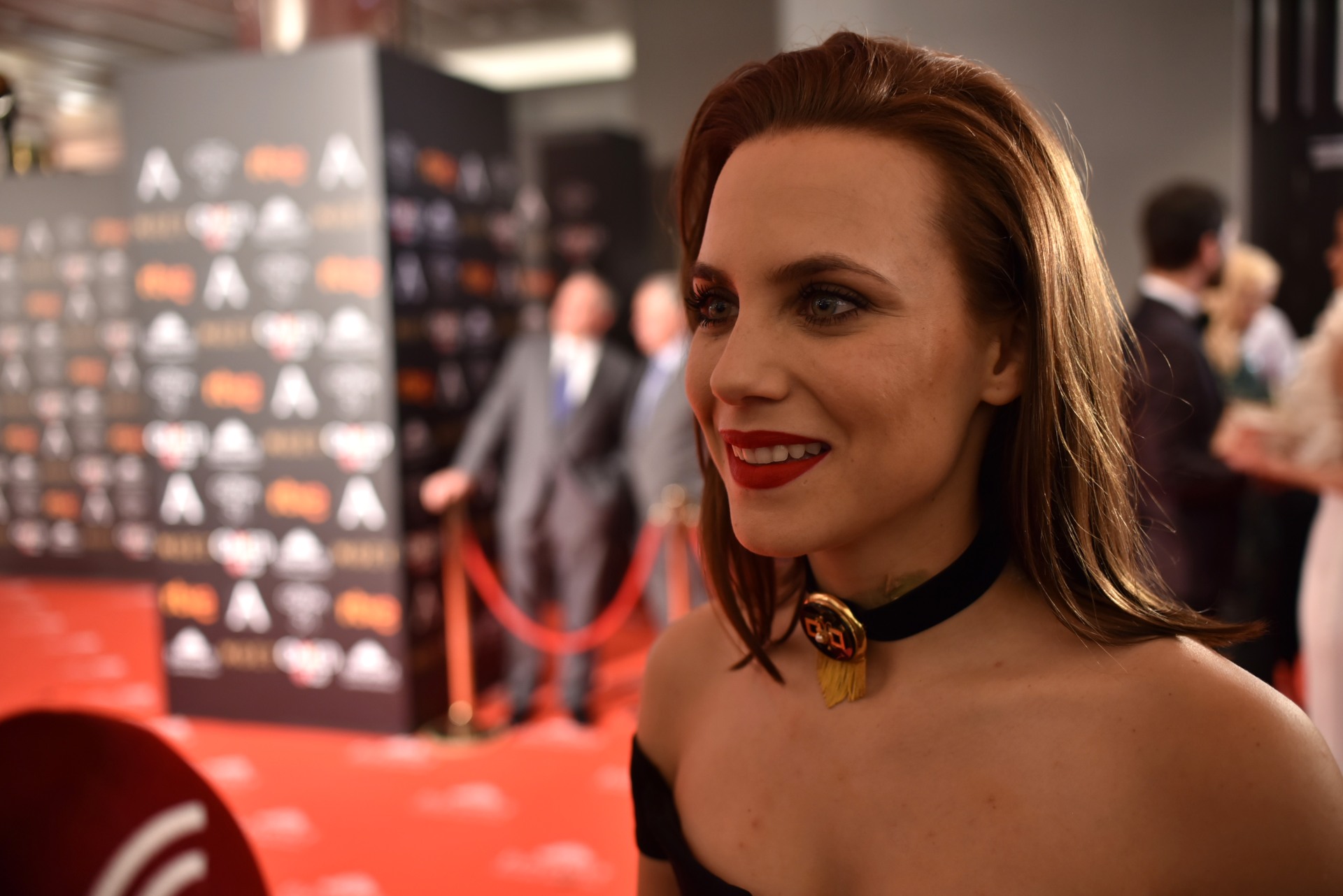 La actriz Miriam Giovanelli cruzando la alfombra roja.