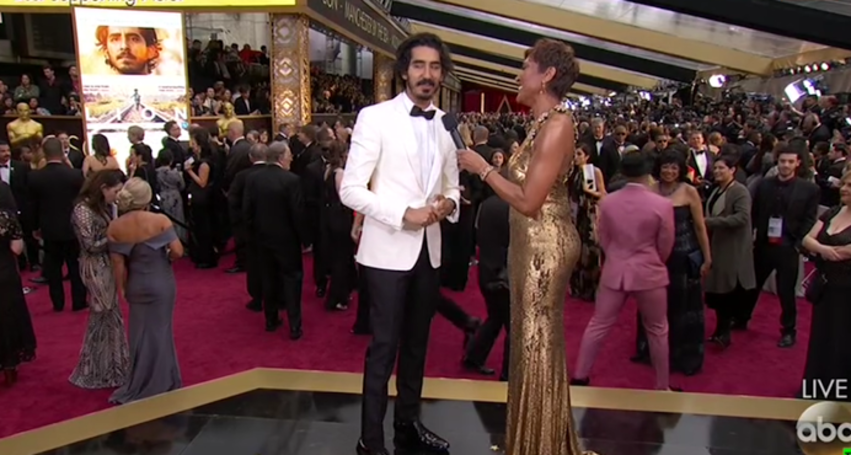 Dev Patel, de blanco y negro, nominado al mejor actor secundario por Lion. El protagonista de El exótico hotel Marigold ha logrado estar en los nominados gracias a la producción apadrinada por Harvey Weinstein.