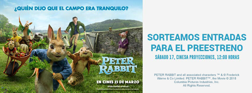 Es Cine regala entradas familiares (hasta agotar existencias) para asistir al preestreno de Peter Rabbit en Madrid (Sábado 17, a las 12:00 horas en el Cinesa Proyecciones) por gentileza de Sony Pictures España. Si quiere asistir sólo tiene que mandar un mail a escine+concurso@esradio.fm e indicar cuántas entradas quiere. No olvide poner su teléfono para ponernos en contacto con los ganadores.