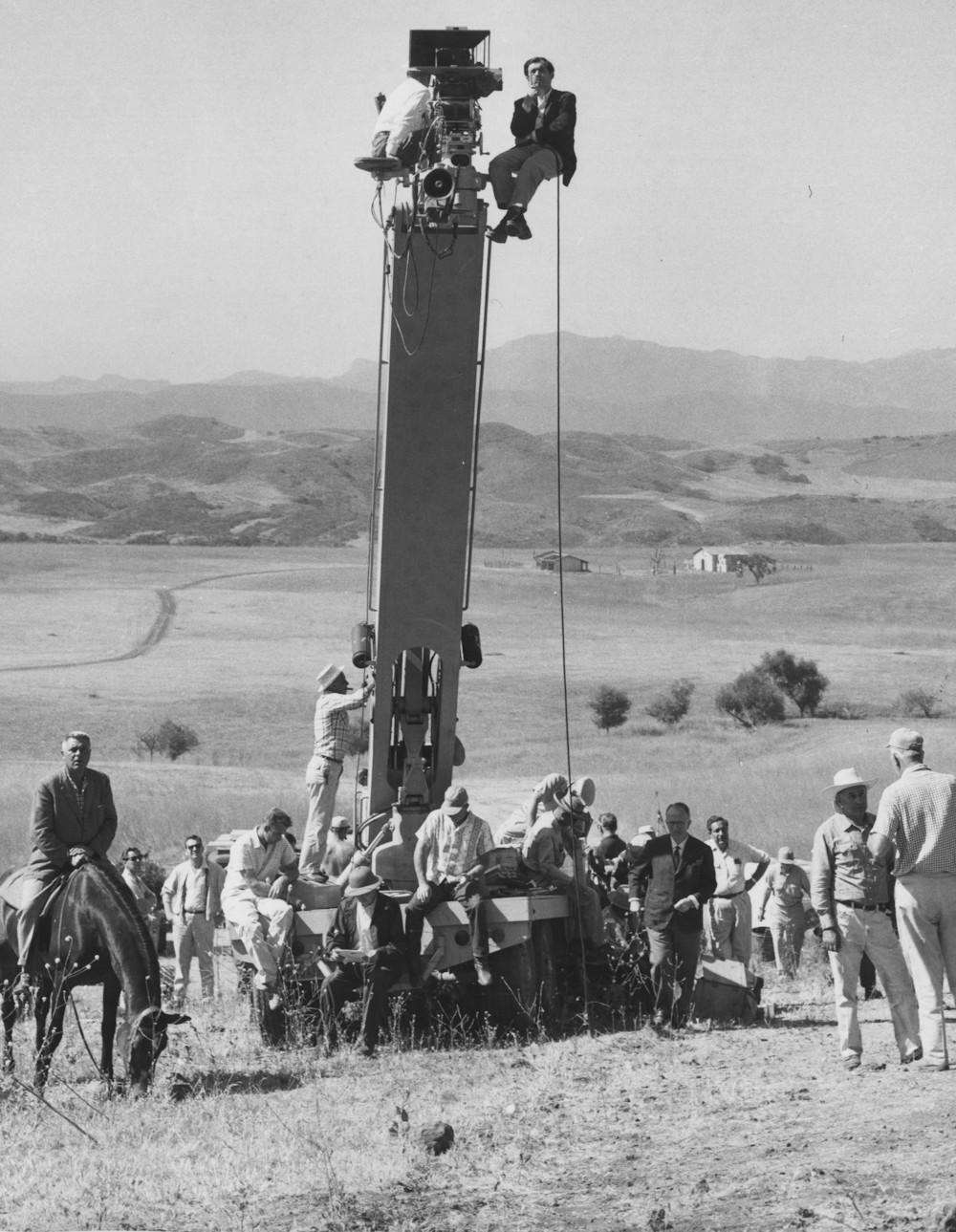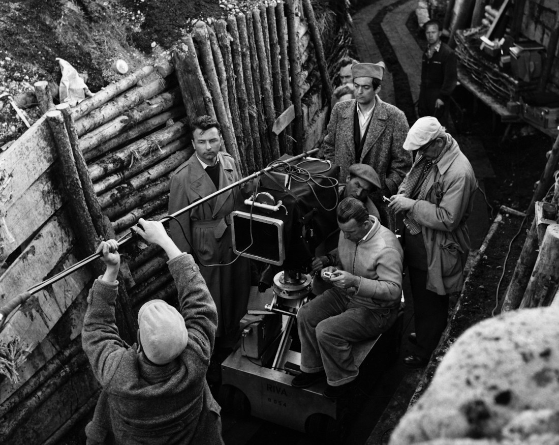 Stanley Kubrick, atrás, con gorro, en el rodaje de Senderos de gloria