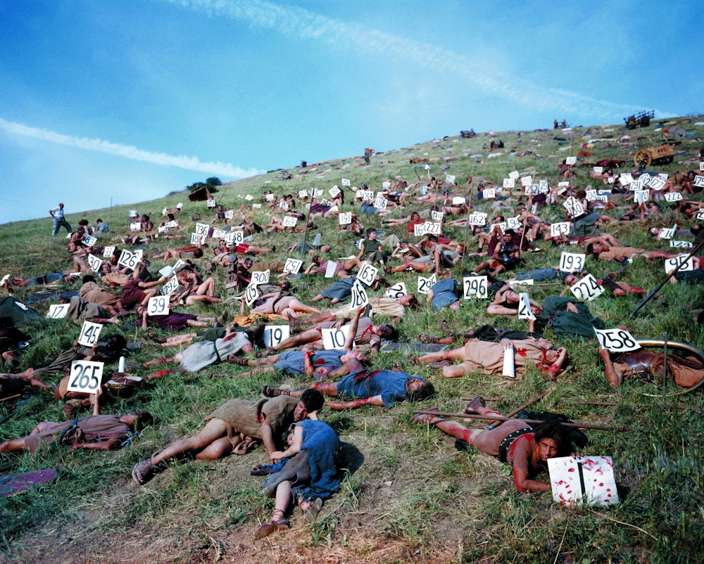 Extras haciendo de muertos, sujetando carteles numerados para facilitar la dirección de Kubrick, en el rodaje de Espartaco.