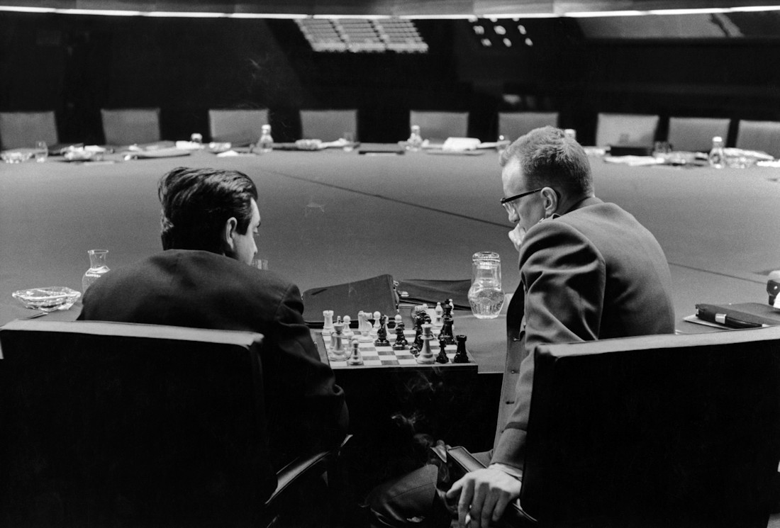 Stanley Kubrick jugando al ajedrez con George C. Scott en el set de rodaje de ¿Teléfono rojo? Volamos hacia Moscú.