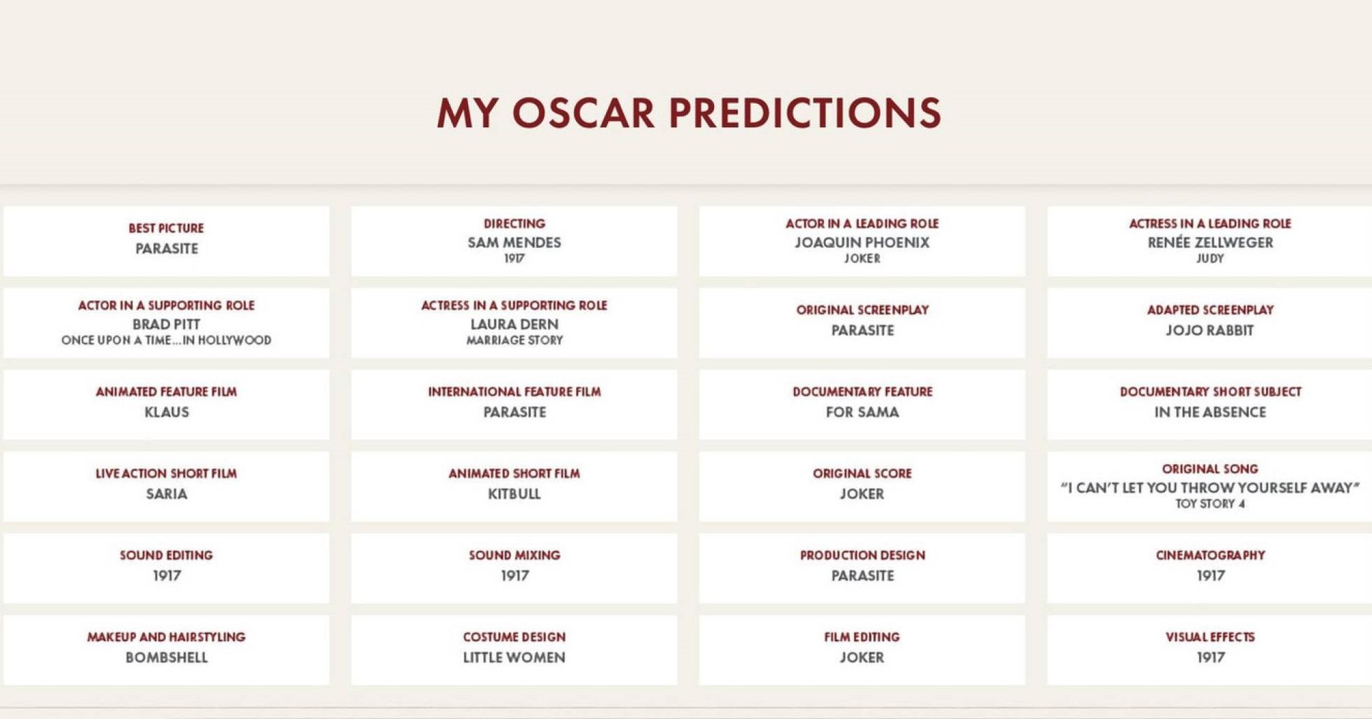 Según recoge EFE, el medio especializado Deadline hizo una captura de pantalla de uno de esos tuits, antes de que la Academia lo borrara, y en el que Parásitos aparecía como Mejor Película, Sam Mendes (1917) como Mejor Director, Joaquin Phoenix (Joker) como Mejor Actor y Renée Zellweger (Judy) como Mejor Actriz.