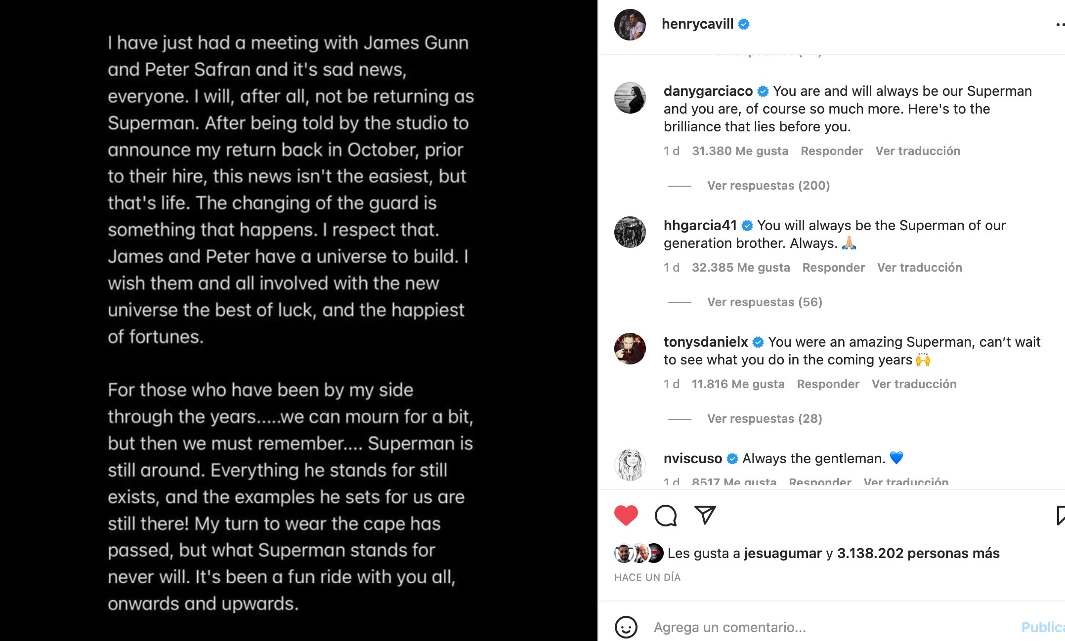 "Acabo de tener una reunión con James Gunn y Peter Safran, y son noticias tristes", escribió de manera amarga Cavill en Instagram, la misma cuenta donde renunció hace escasas semanas a proseguir con la serie The Witcher para, presumiblemente, afrontar su nuevo futuro con el Hombre de Acero. "Después de todo, no voy a volver como Superman. Una vez el estudio me permitiera anunciar mi regreso en octubre, antes de que me contrataran, esta noticia no es la más fácil, pero así es la vida. Lo respeto. James y Peter tienen un universo que construir. Les deseo a ellos y a todos los implicados en el nuevo universo la mejor de las suertes y la más feliz de las fortunas".
