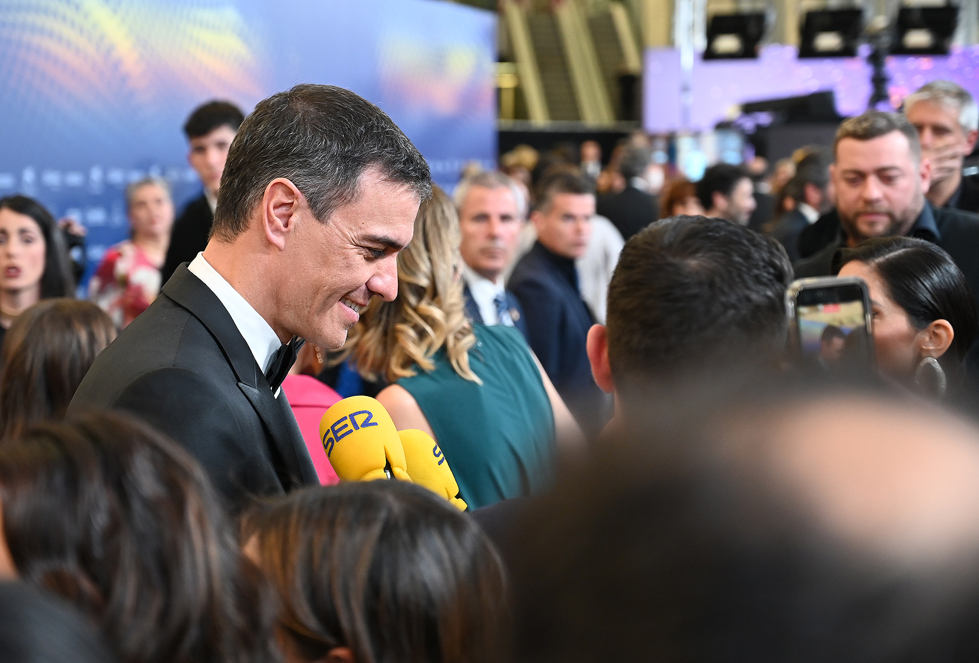 El presidente del Gobierno, Pedro Sánchez, como si de una estrella de cine se tratase, rodeado de cámaras.