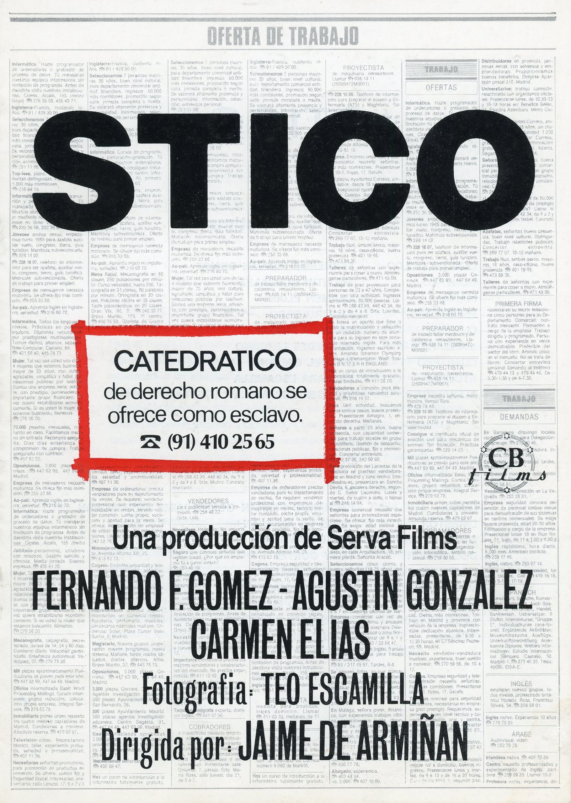 Como si el serio Jacinto Benavente adaptase al cómico Miguel Mihura, El amor del capitán Brando (1974), también hoy sería propuesta para su cancelación por la tropa feminista terf por un insólito trío amoroso entre un joven maestro, un alumno menor de edad y un viejo republicano. Paradójicamente, resulta más reaccionario un progre de hoy que un facha de ayer. Por no hablar de El nido (1980), una vuelta de tuerca sobre la temática del viejo verde, pero desde la delicadeza sin cursilería y la transgresión sin vitriolo. Aunque quizás la más subversiva, entre Kafka y Valle Inclán, es Stico (1984), sobre un profesor de Derecho Romano descontento con su vida que se ofrece como esclavo a un antiguo alumno a cambio de comida y alojamiento. Nadie como Armiñán ha combinado lo tremendamente serio con lo cáusticamente divertido sin perder el ademán de señor de Soria perfectamente formal aunque el espíritu rebelde un punk de Londres.