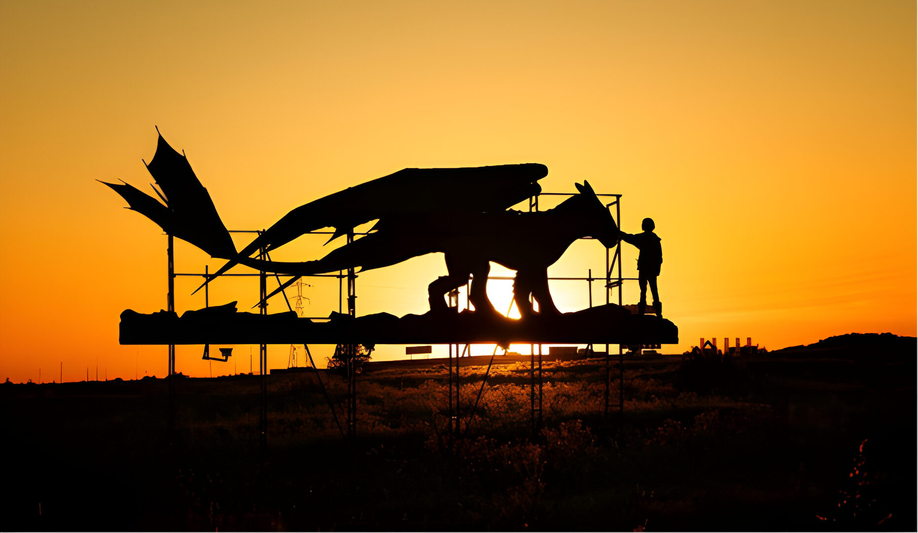 La instalación, de 12 metros de largo por 6 de alto, reinterpreta a gran escala la mítica imagen del protagonista cuando acaricia al dragón por primera vez. Visible desde la carretera en dirección salida de Madrid, la silueta está compuesta por 40 chapas metálicas negras y cuenta con un diseño que recuerda a las icónicas figuras recortadas del toro que forman ya parte del paisaje visual de nuestras carreteras, estableciendo un guiño emocional al imaginario colectivo. Además, cuenta con un sistema de iluminación ad hoc que potencia la espectacularidad de la escena durante la noche.