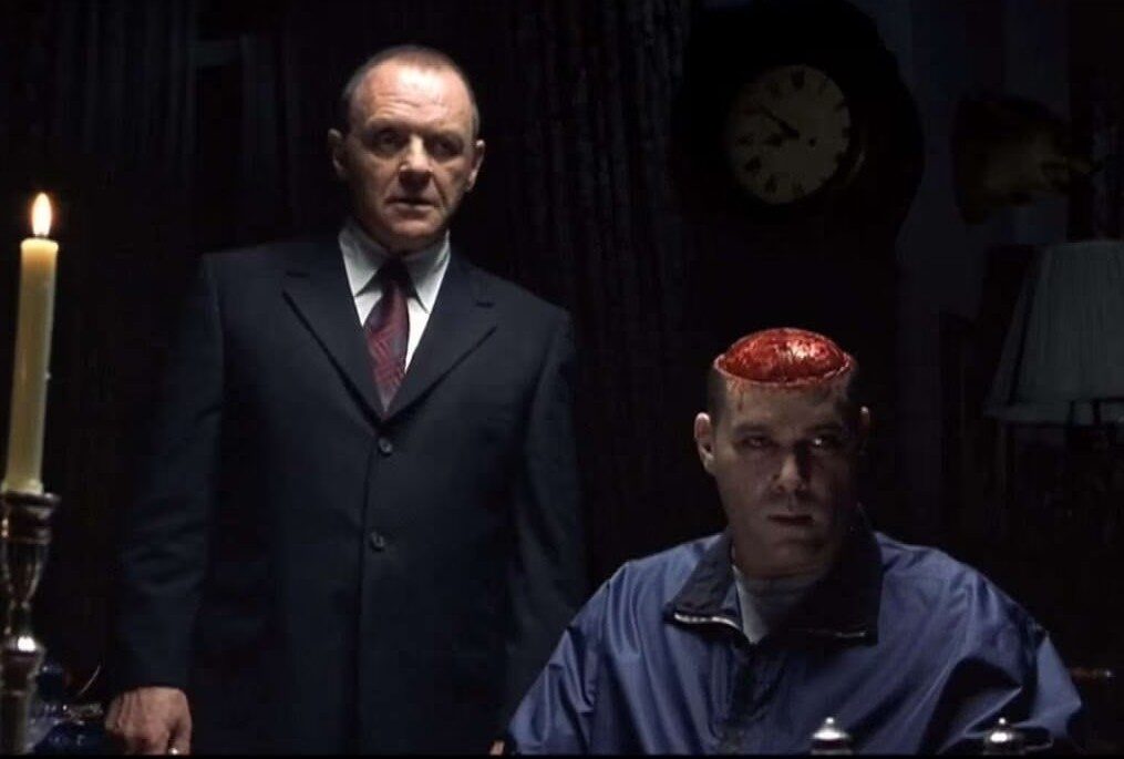 En Hannibal (2001) tenemos otra escena emblemática en la que Hopkins prepara el cerebro de uno de sus compañeros de reparto. Con la víctima viva, cocinado con mantequilla y hierbas, nadie puede dudar de que el plato podría tener buen sabor pese a resultar grotesco.