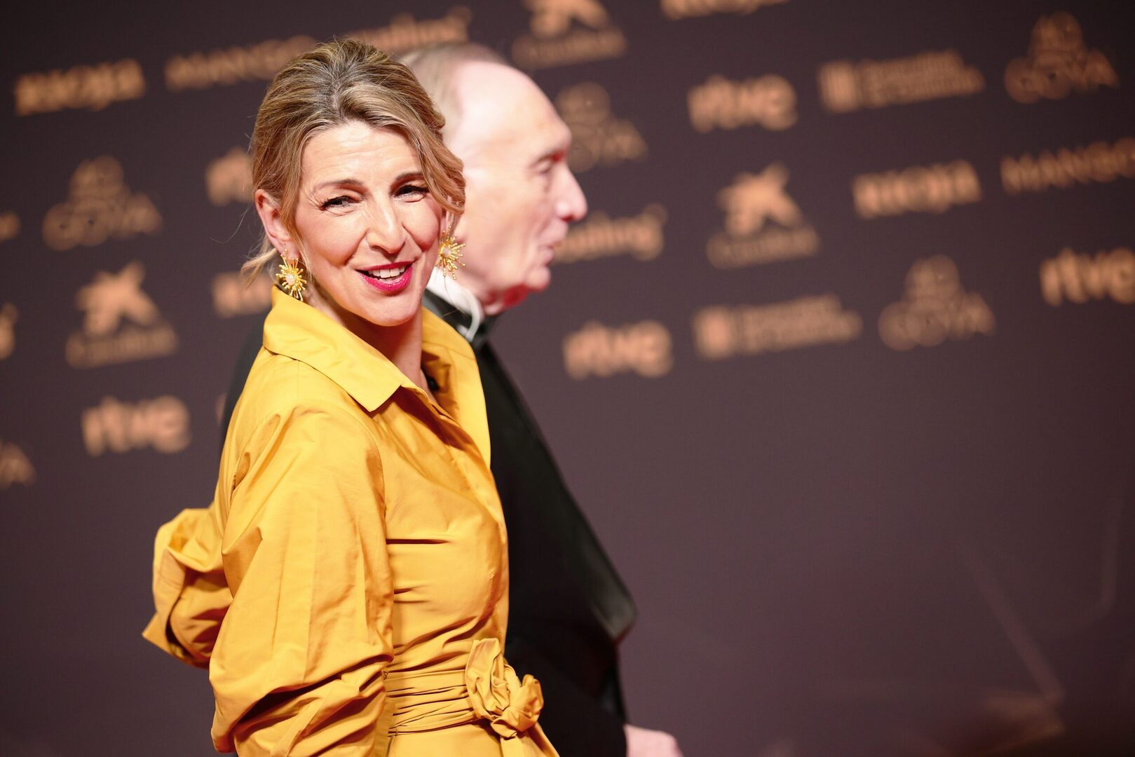 Yolanda Díaz no pasó por la alfombra roja ni posó para los medios en medio de la polvareda levantada por el viaje. Para la gala, eligió un vestido de la firma gallega Purificación García, de color beige, con una pashmina al hombro. Como complemento, la mandataria llevó unos pendientes estilo arete en forma de sol.