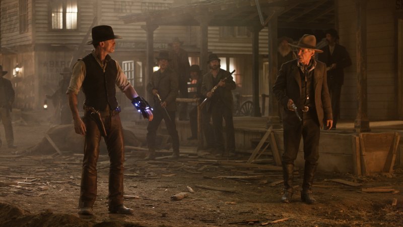 1873. Territorio de Arizona. Un desconocido (Craig) sin recuerdos de su pasado tropieza en el desierto con la hosca villa de Absolution. La única pista de su historia es un misterioso grillete sujeto en una de sus muñecas. Lo que descubre es que la gente de Absolution no recibe con agrado a los forasteros, y nadie se mueve por sus calles sin que se lo ordene el autoritario coronel Dolarhyde (Ford). Es un pueblo que vive en el terror. Pero Absolution está a punto de experimentar un terror que apenas puede comprender al ser atacado el pueblo por unos seres malvados del espacio. Descendiendo estrepitosamente a una velocidad asombrosa y con unas luces cegadoras para abducir uno a uno a los indefensos lugareños, estos monstruos no se parecen a nada que los del pueblo hayan visto antes. Ahora, el forastero al que rechazaron es su única esperanza de salvación. A medida que este pistolero va recordando lentamente quién es y dónde ha estado, se da cuenta de que conoce un secreto que podría darle un arma al pueblo en su lucha contra los alienígenas. Con la ayuda del esquivo viajero, Ella (Olivia Wilde) reúne a una tropa de antiguos adversarios (gente del pueblo, Dolarhyde y sus muchachos, forajidos y guerreros apache), todos ellos en peligro de ser aniquilados. Unidos frente a un enemigo común, se prepararán para un épico enfrentamiento por la supervivencia.