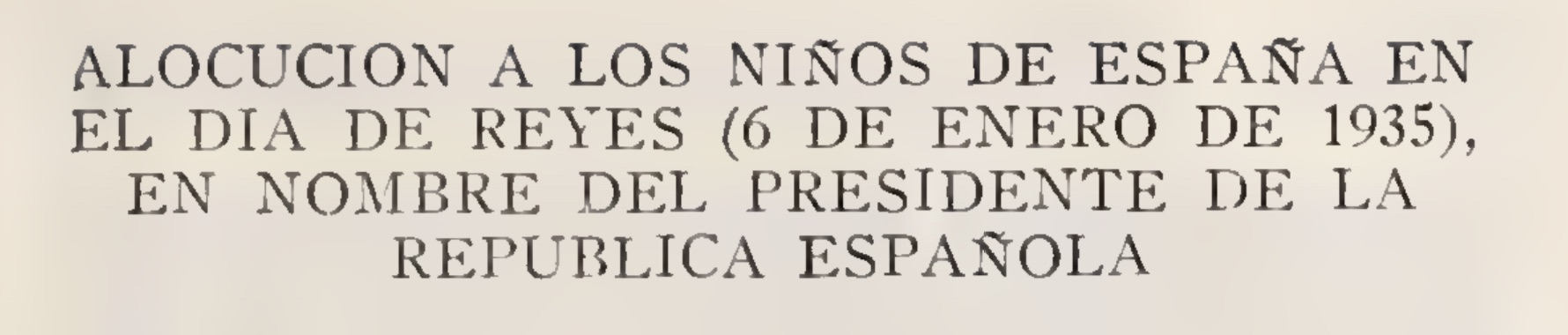 "Hoy, el día en que se celebra en el mundo cristiano la Adoración del Niño Dios por los santos Magos —llamados después Reyes— Melchor, Gaspar y Baltasar —fiesta que viene de abuelos a abuelos y de nietos a nietos hace siglos—, venimos vuestros mayores —padres, tíos y abuelos— a regalaros juguetes de toda clase —menos pistolas— para que aprendáis a jugar en paz en la vida, a jugar en paz la vida. Y, sobre todo, venimos a que nos perdonéis. A que nos perdonéis muchos pecados contra vosotros y, sobre todo, el de que no siempre os dejemos jugar en paz...con este agasajo, con esta fiesta queremos ganar, más que vuestro agradecimiento, vuestro perdón. Perdón, niños de España para vuestros mayores."