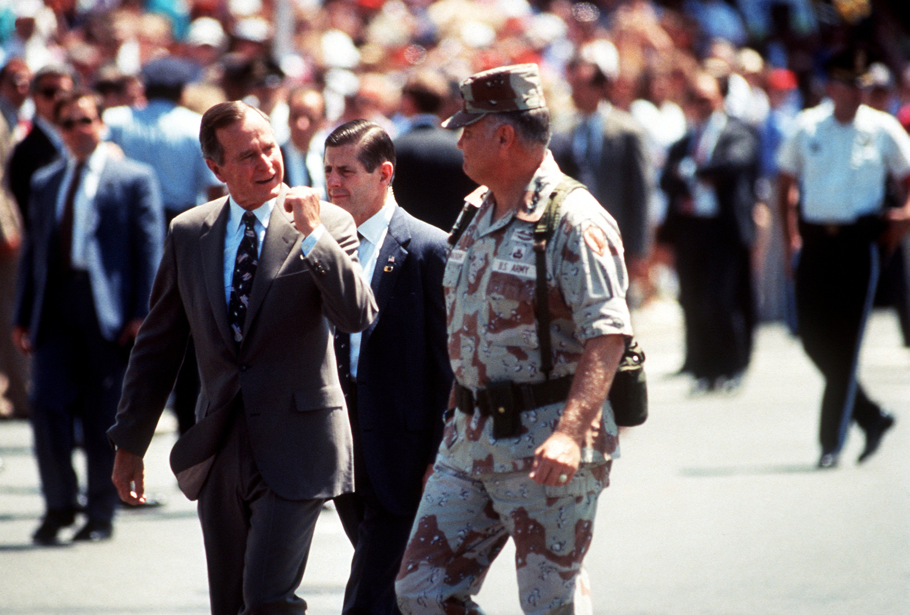 El presidente de Estados Unidos, George Bush hablando, con el general Norman Schwarzkopf, encargado de la ofensiva aliada durante la guerra del Golfo.