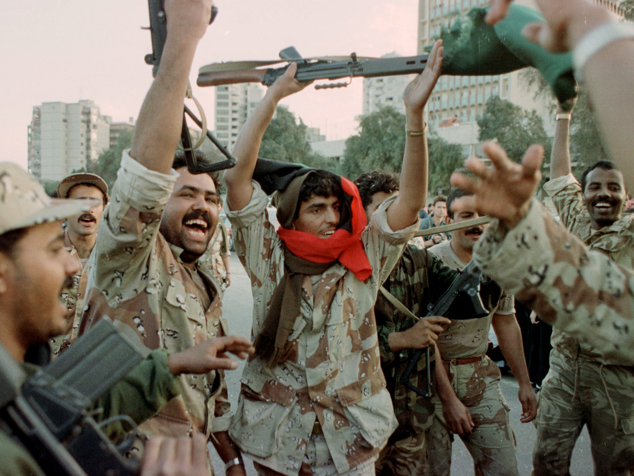 El 1 de marzo de 1991 soldados árabes, incluyendo a los kuwaitíes y saudíes, celebran en las calles de Kuwait la liberación de la ciudad de las fuerzas iraquíes.