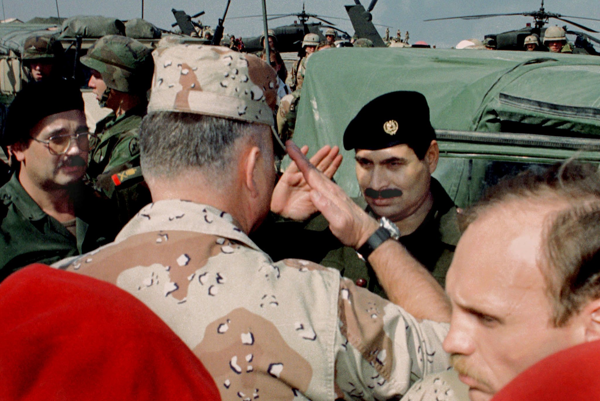 3 de marzo de1991 en Safwan, base aérea en el interior Iraq ocupado. El general estadounidense Norman Schwarzkopf, comandante aliado de la Guerra del Golfo, saludando Lt General Sultan Hashim Ahmad de Irak tras de las conversaciones para discutir los términos de un alto el fuego y la rendición.