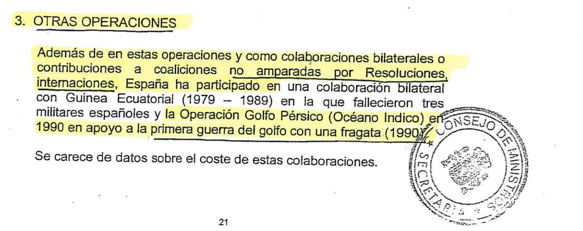 Para mayor sorpresa, en el apartado "otras operaciones, no amparadas por Resoluciones Internacionales", el Decreto incluía la Operación Golfo Pérsico en 1990 en apoyo a la primera guerra del Golfo con una fragata de la Armada Española. Gobernaba Felipe González. Según el Decreto elaborado por De la Vega, esta sí fue una guerra ilegal. El PSOE envió a aquella guerra soldados de reemplazo y no profesionales como los que se movilizaron en la segunda guerra de Irak.