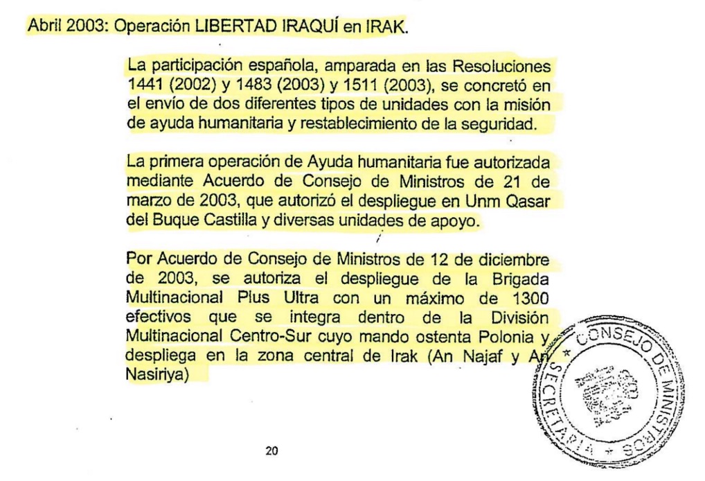 En la Memoria Justificativa que acompañaba al Decreto se incluía un listado de las operaciones del Ejército español en el exterior amparadas por resoluciones de las Naciones Unidas. En abril 2003, la "Operación Libertad Iraquí en Irak" dice: