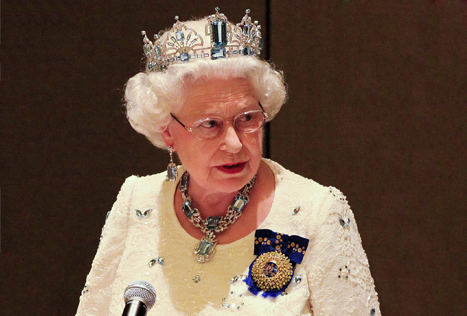 La reina Isabel II posa con la corona de diamantes de la reina Victoria.