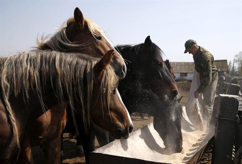 Un trabajador alimenta caballos en la Reserva Radioecológica Estatal dentro de la zona de exclusión a 30 kilómetros del reactor nuclear. Regularmente se hacen controles para vigilar los radioisótopos.