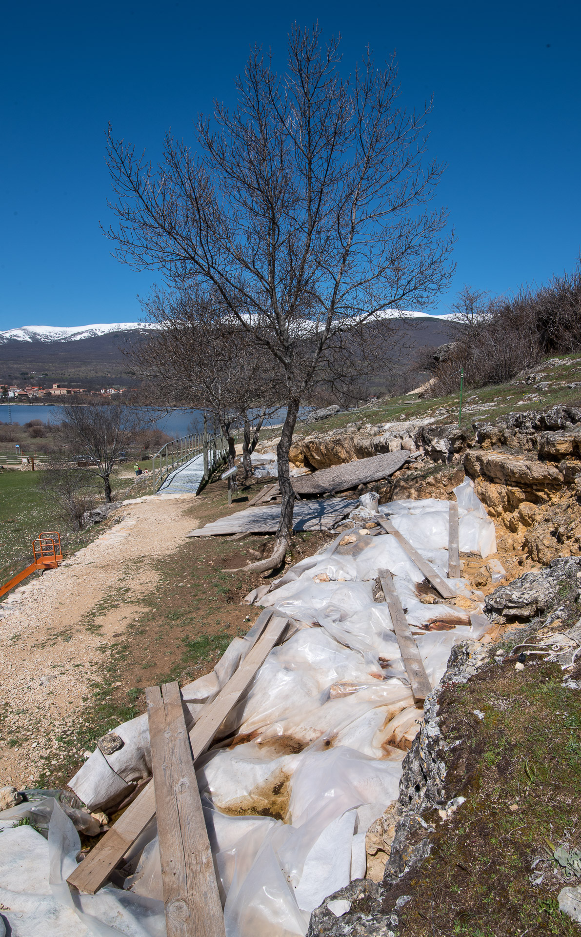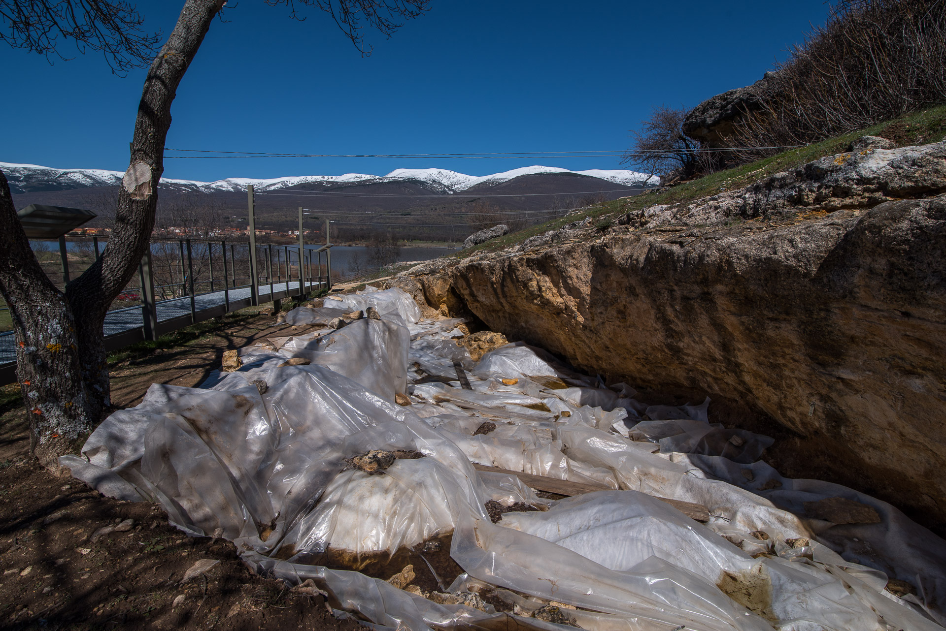 El abrigo de Navalmaíllo, cubierto por plásticos que defienden los restos aún por excavar de las inclemencias de la superficie