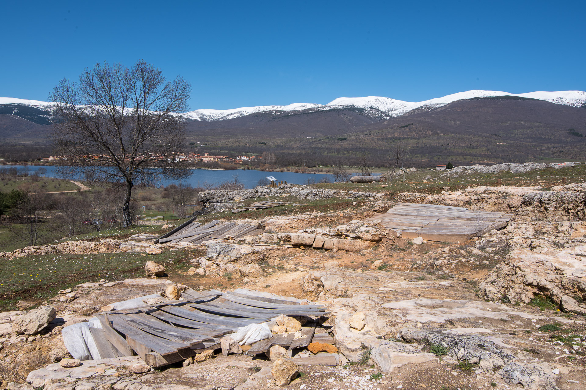 La Cueva Des-Cubierta, bajo las maderas en primer plano, y al fondo el Embalse de Pinilla, Pinilla del Valle y la Sierra de Guadarrama