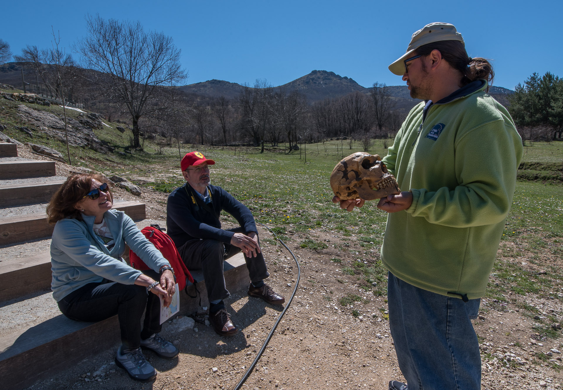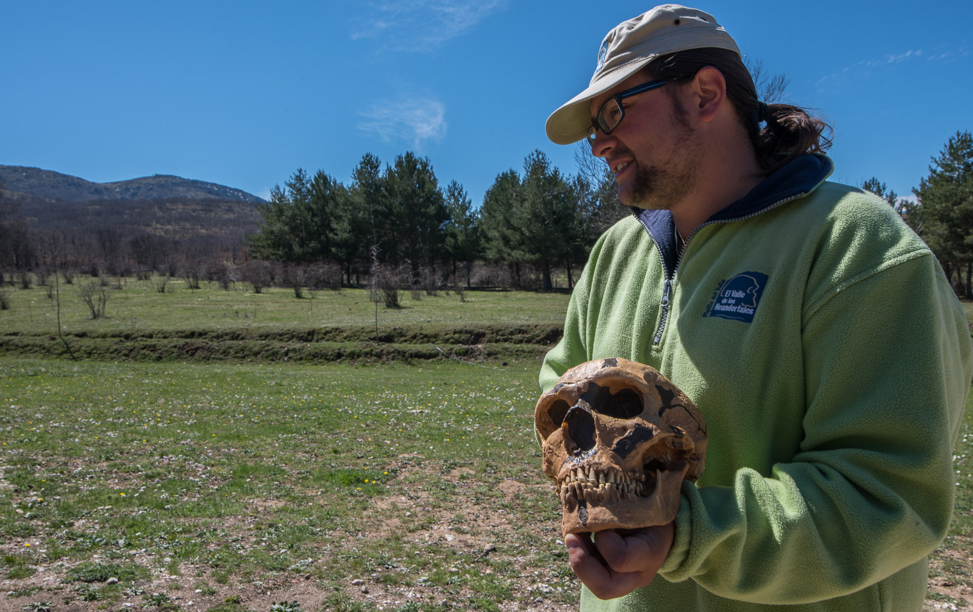 Uno de los guías oficiales del Valle de los Neandertales inicia sus explicaciones con una reproducción de un cráneo de neandendertal