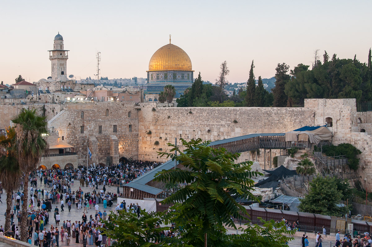 Jerusalén, es considerada una ciudad sagrada por tres de las mayores religiones monoteístas: el judaísmo, el cristianismo y el islam. En la fotografía el Muro, con la prominente y dorada figura de la Cúpula de Roca de fondo.