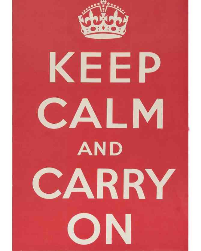 El gobierno británico sabía de la importancia de mantener a los ciudadanos centrados en sus actividades y por eso ideó una campaña. Diseñó unos carteles rojos con grandes letras en blanco coronados por el emblema Real donde se podía leer "KEEP CALM AND CARRY ON", en español "MANTÉN LA CALMA Y CONTINÚA ADELANTE". Sobre el eslogan aparecía la corona de los Tudor, que los ingleses identifican inequívocamente con su país. Paradójicamente y pese a ser imprimidas 2 millones y medio de unidades, la propaganda nunca fue distribuida masivamente y permaneció en el anonimato hasta el año 2000. Uno de los carteles fue descubierto en casa de un librero del norte de Inglaterra y popularizado en multitud de tazas, camisetas, llaveros… Funcionaba el mandato sencillo, el potente mensaje. En los años 40 las autoridades pensaron que la campaña podría interpretarse como demasiado superficial y como un derroche económico. Que se sepa la mayoría de los pósters diseñados por el Ministerio de Información en el verano de 1939 fueron reciclados por la escasez de papel en la época. Todos menos una veintena acabaron en pulpa.