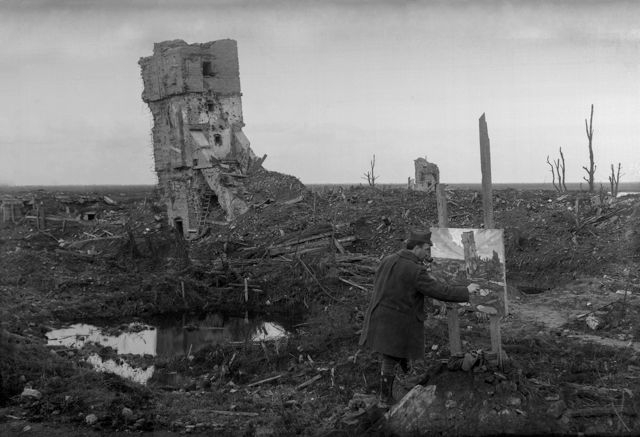 Sileno no contaba los hechos, los interpretaba. Es una visión intelectual que se contrapone con una visión directa que completa la exposición: la sección "Paisajes en la batalla", que reúne una docena de fotografías realizadas por Arthur Brusselle y los hermanos Maurice y Robert Antony y cedidas por el Gobierno de Flandes y el Museo de Brujas. Es un acercamiento al campo de batalla el día después (1918-1921), un escenario en ruinas donde resurge la vida.