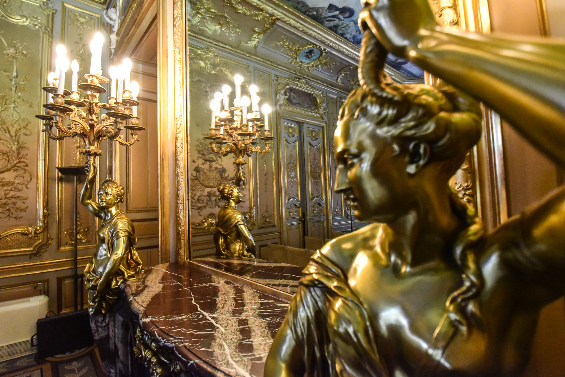 Lámparas y bronces de París y estatuas sosteniendo unos grandes candelabros, el interior de la sala Rubén Darío.