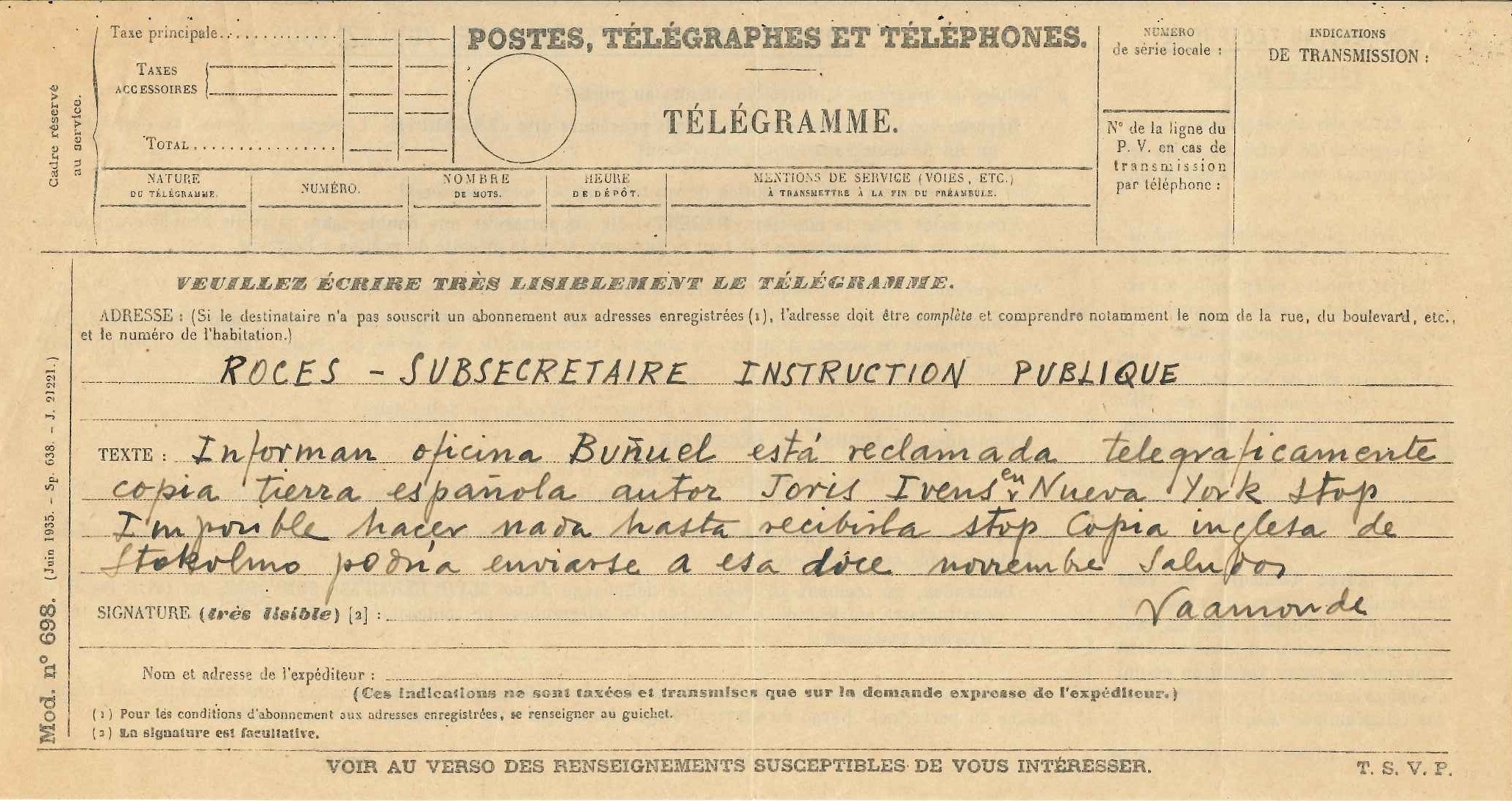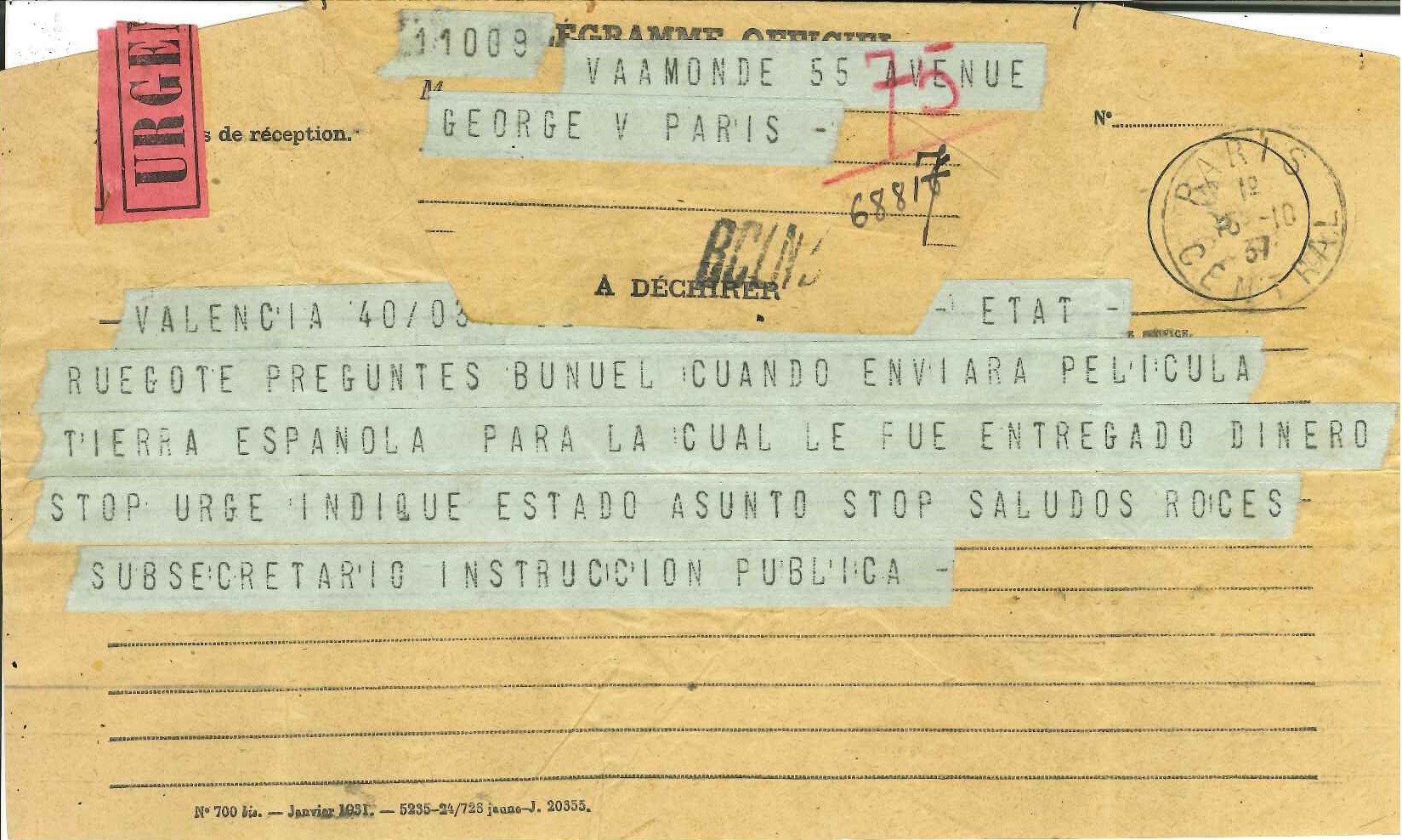 Telegrama hallado en relación a Buñuel | Archivo de Salamanca