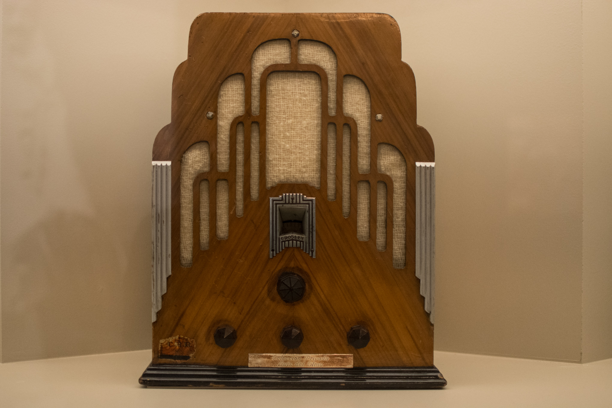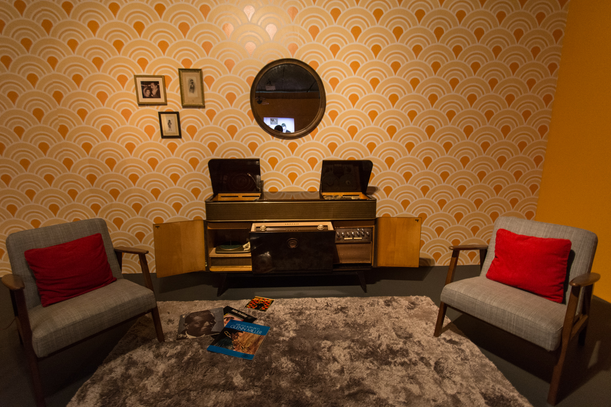 Una recreación de una habitación con dos sillones y una radio tocadiscos.