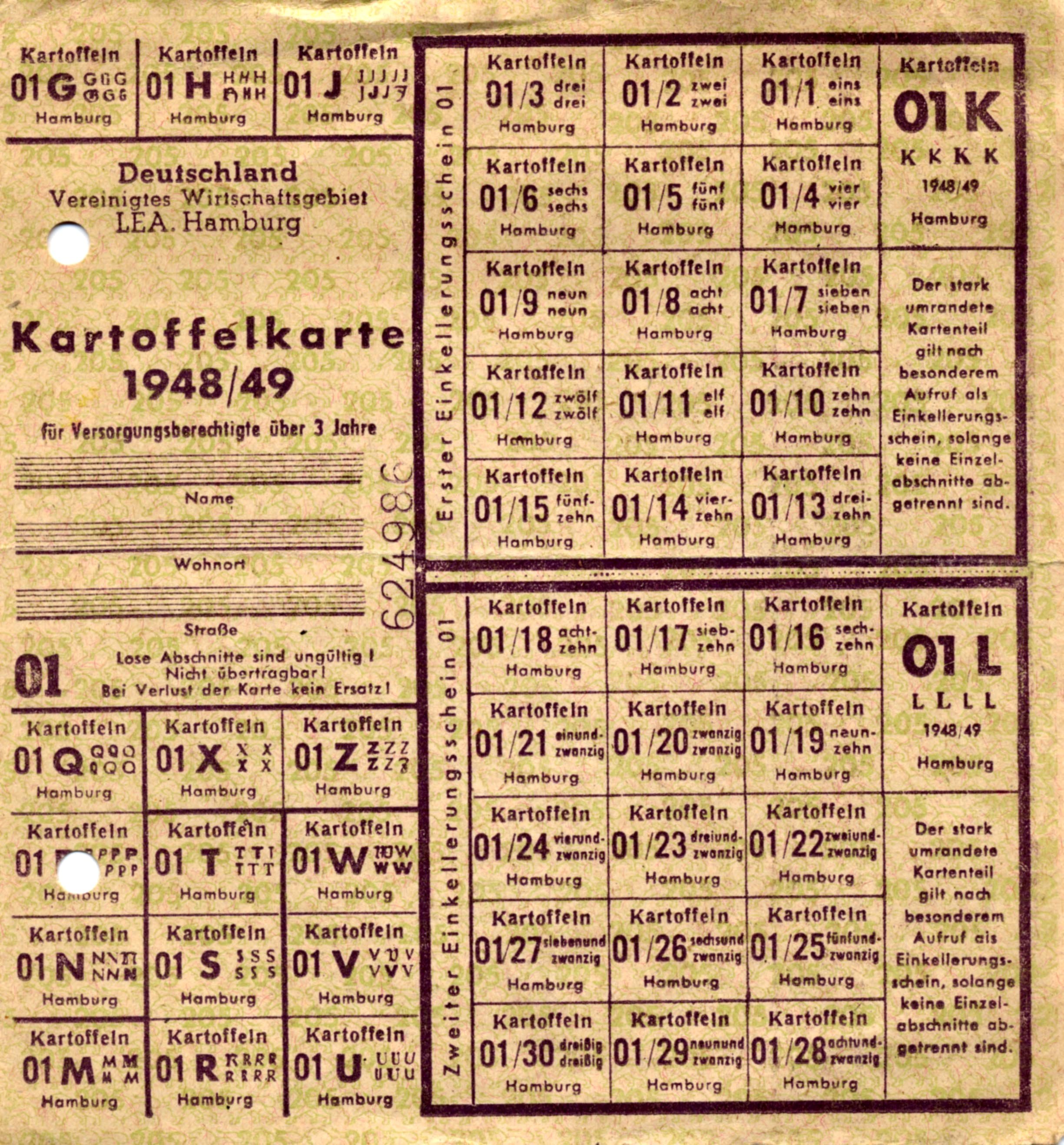 A los pocos días de estallar la guerra, el 15 de septiembre el III Reich impuso el racionamiento de alimentos, que en la zona occidental (la República Federal) duró hasta 1950 y en la oriental (RDA) hasta 1958.