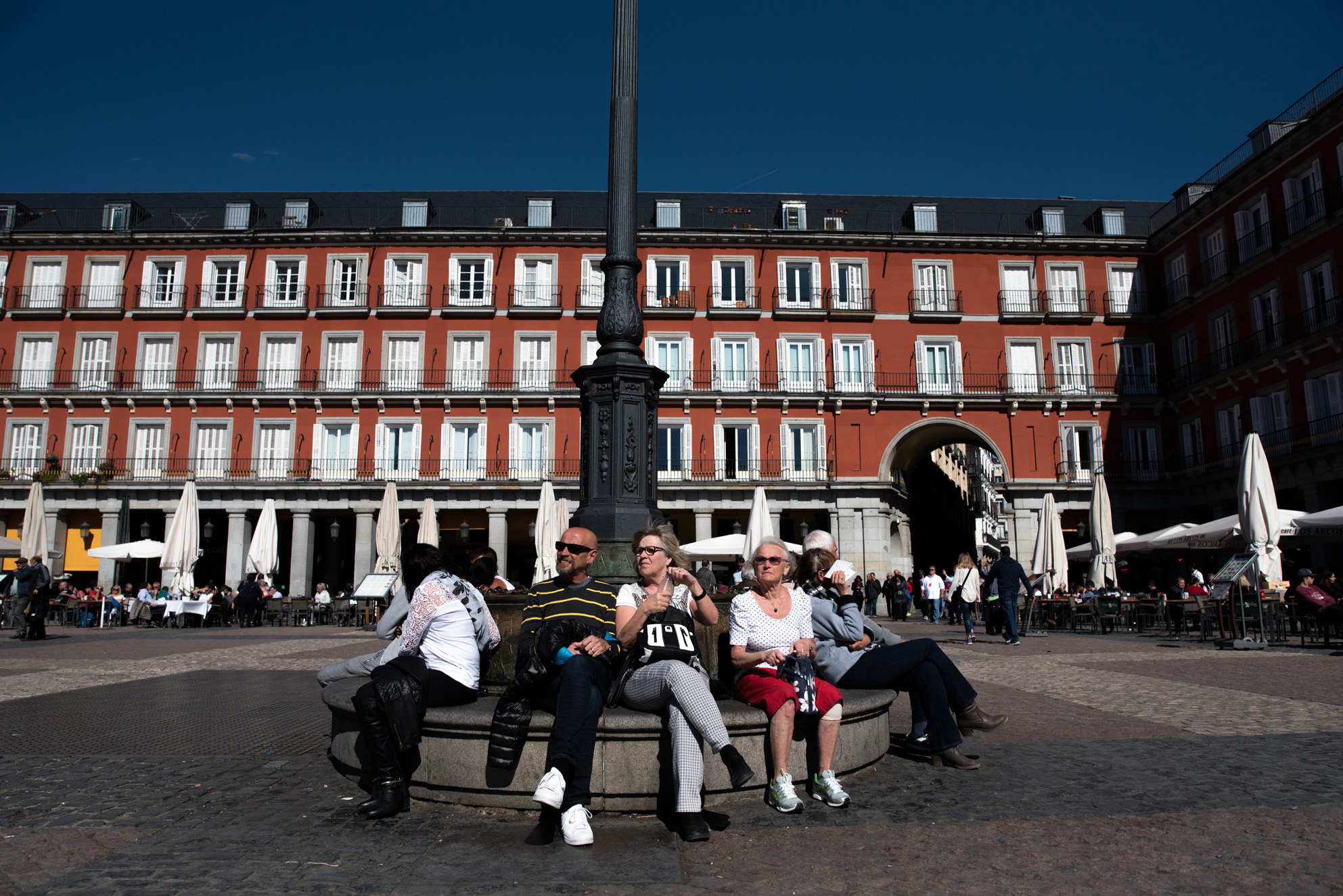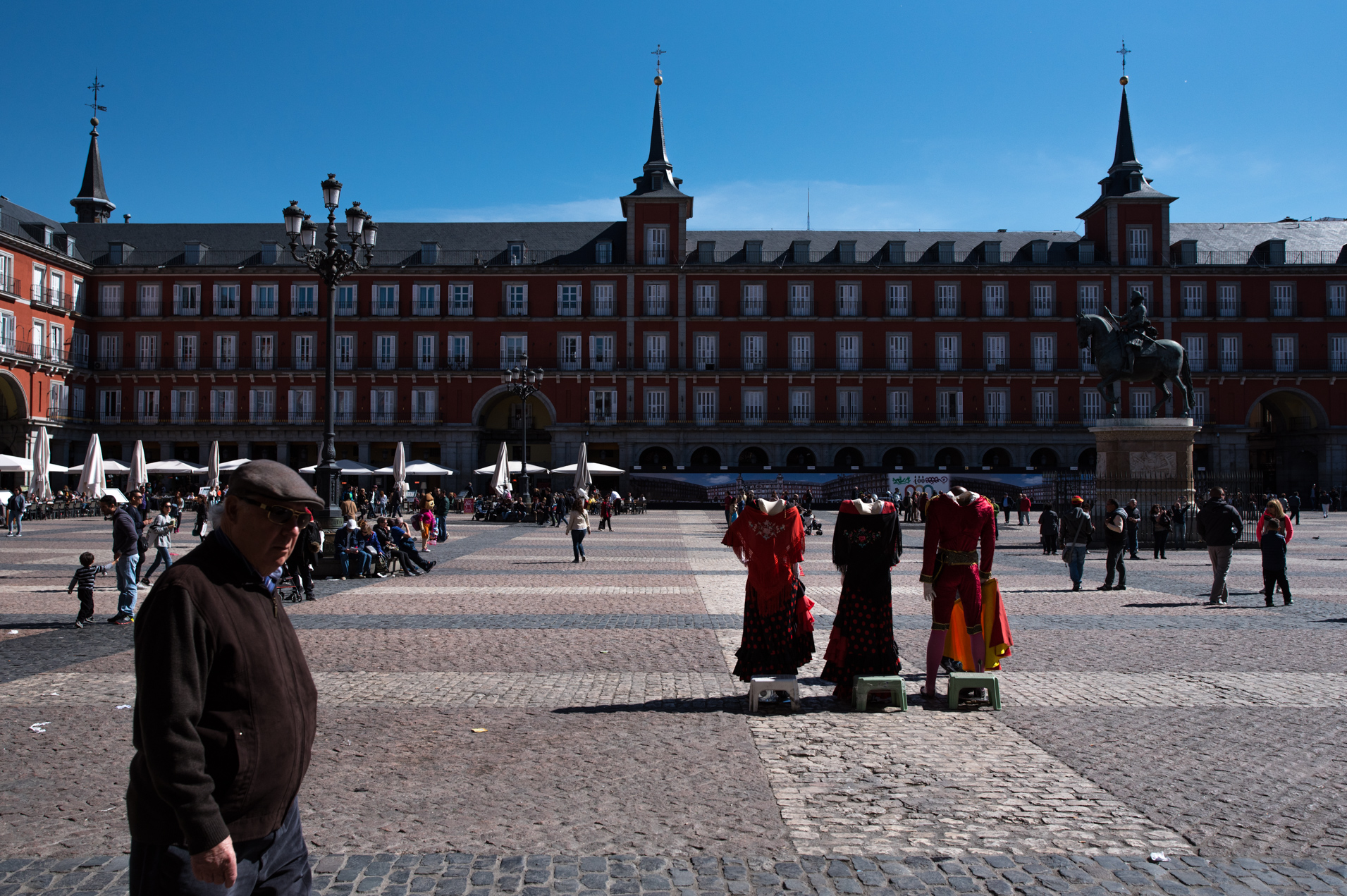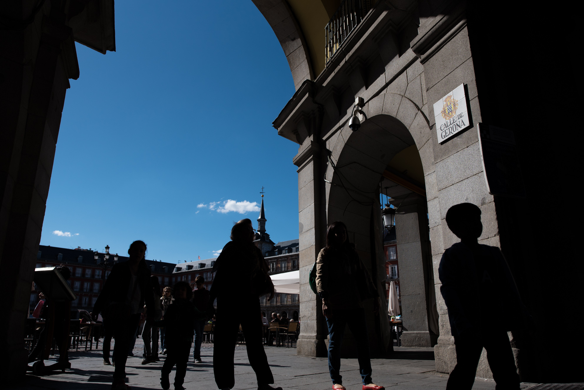 Después de pasar por varias etapas, a lo largo de cuatro siglos, la Plaza Mayor de Madrid ha sido un punto de encuentro de muchos acontecimientos y personas de diferente condición. Actualmente es uno de los lugares más concurridos por turistas de diferentes países. De fondo, en los soportales, una de las puertas de entrada a la plaza, por la calle de Gerona.