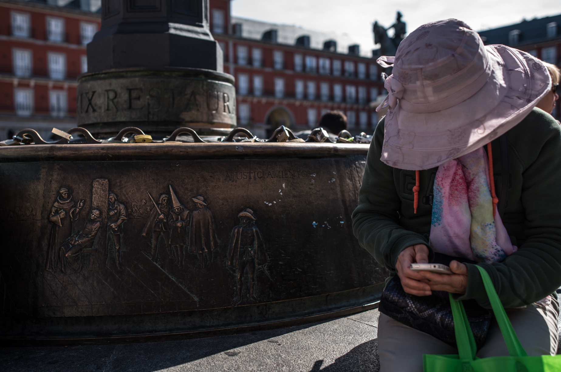 Las farolas de la Plaza Mayor guardan una curiosidad oculta en sus asientos. Cada una de ellas tiene en su respaldo una serie de bajorrelieves en bronce que cuentan algunos de los episodios históricos que han tenido lugar en la Plaza, como por ejemplo en este caso, los ajusticiamientos y autos de fe.