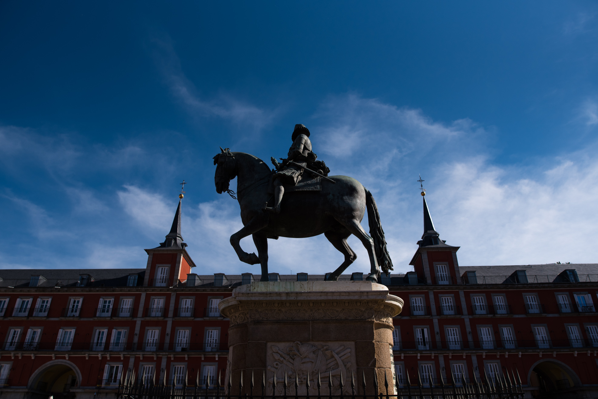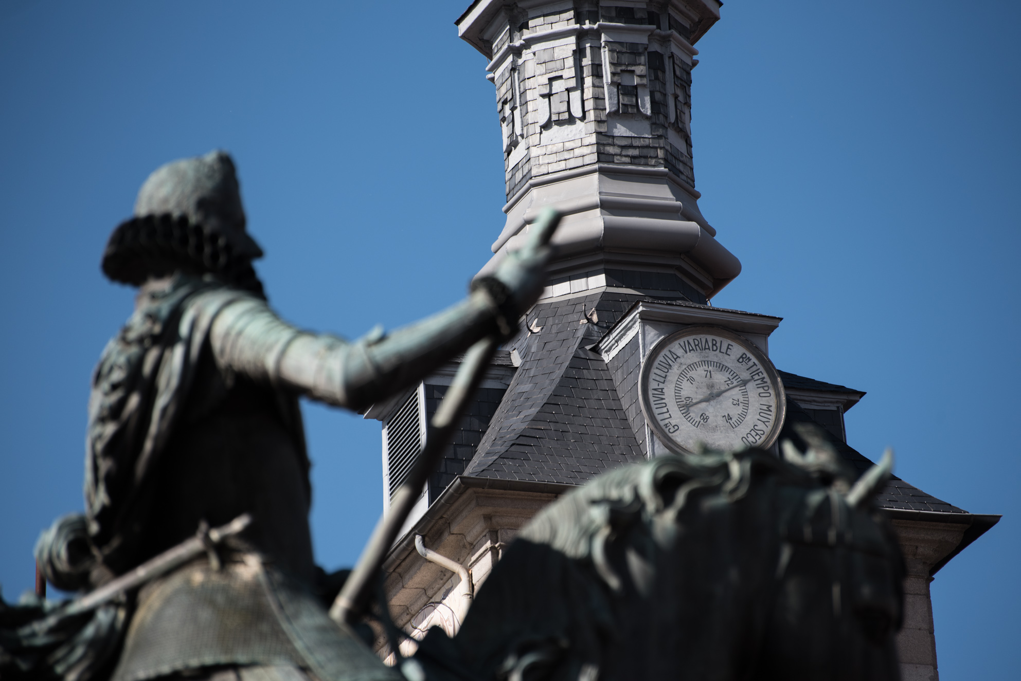 La Plaza Mayor empezó a cimentarse sobre el la zona donde se ubicaba la antigua Plaza del Arrabal, lugar de referencia para el mercado más popular de la villa a finales del siglo XV, cuando se trasladó la corte de Felipe II a Madrid. De fondo, la estatua ecuestre de Felipe III y la Casa de la Carnicería, que será reconvertida en un hotel de lujo a partir de 2019.