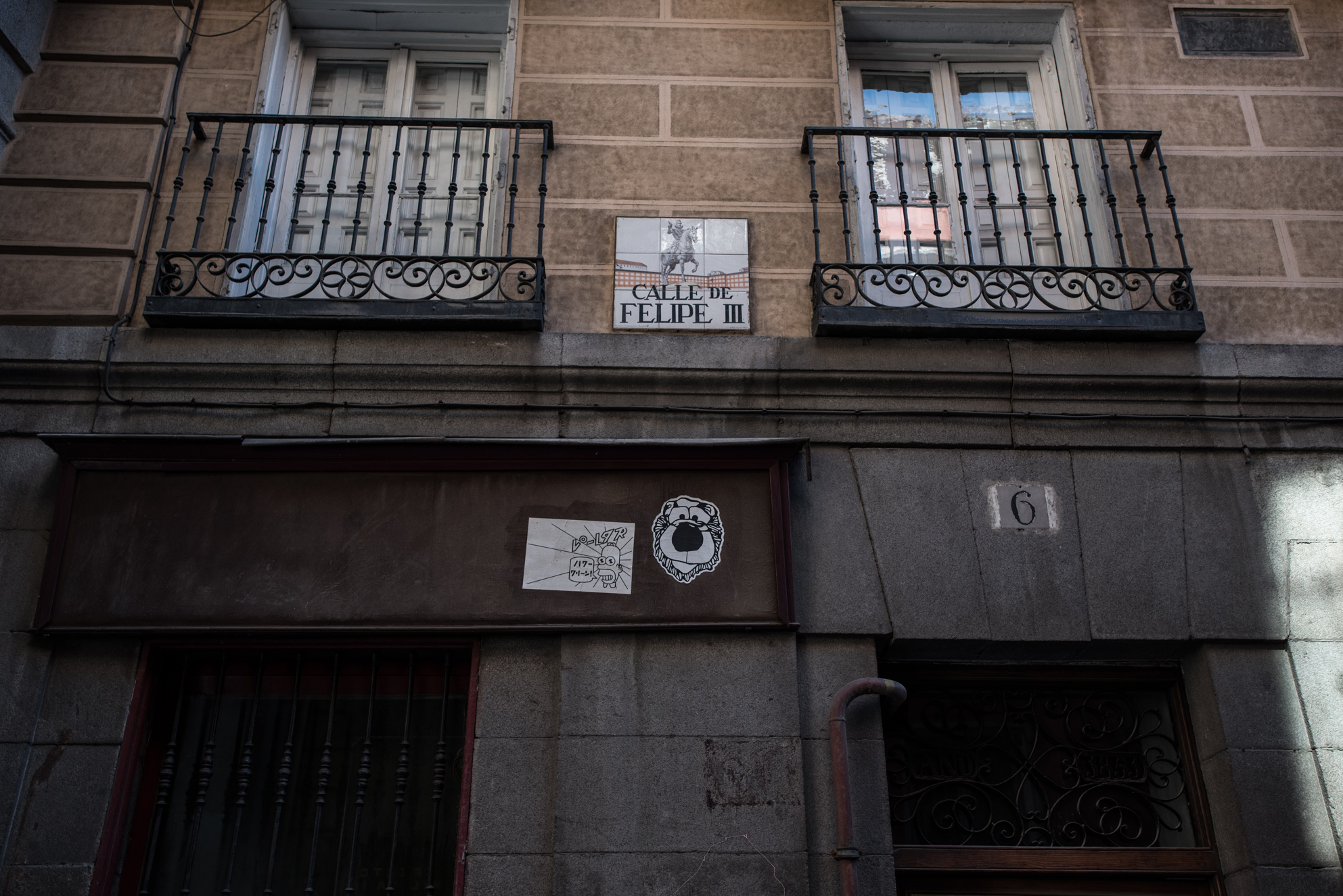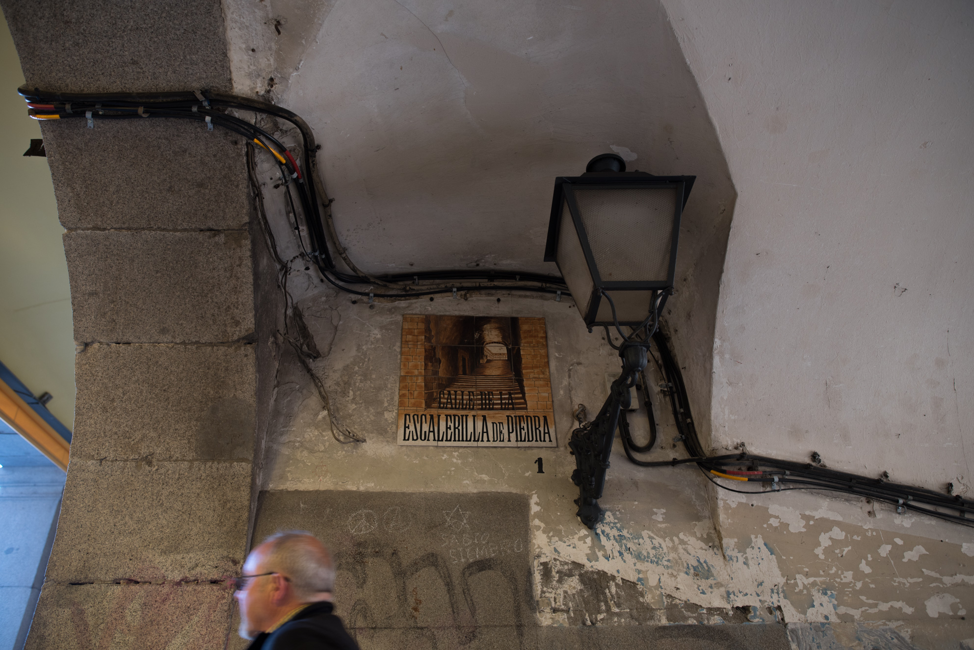 Para acceder a la Plaza Mayor de Madrid por el Arco de Cuchilleros hay que pasar por la calle de la Escalera de Piedra cuyo cartel es otra de las curiosidades de este rincón con tanta historia.
