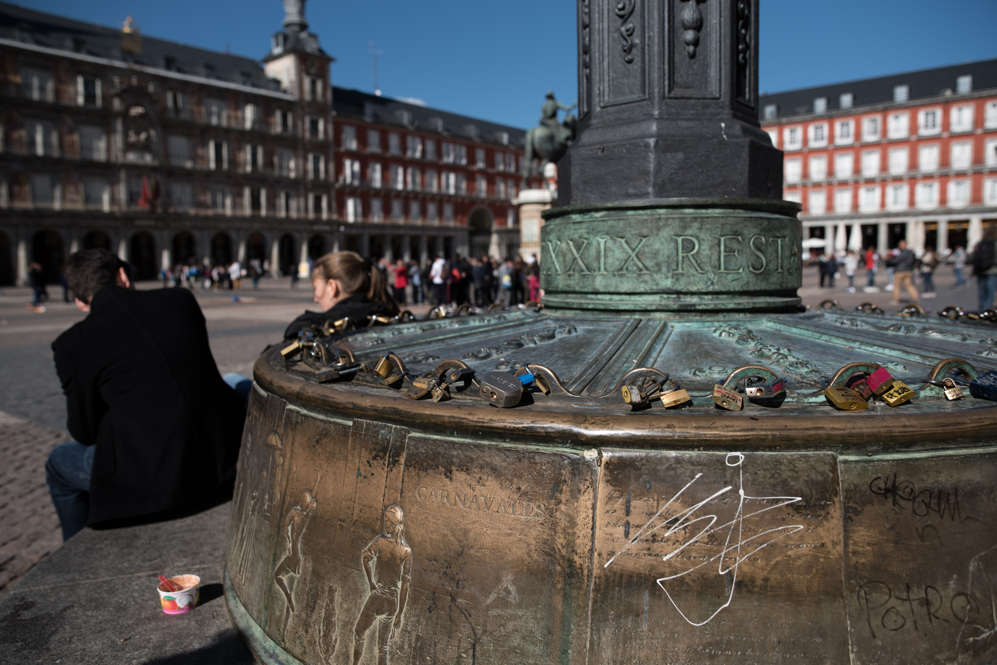 Otra de las farolas donde desde hace algunos años han sido colocados candados voluntariamente por las personas que se acercaban a la misma. En la base, un bajorrelieve recordando la importancia de los carnavales para la ciudad de Madrid.