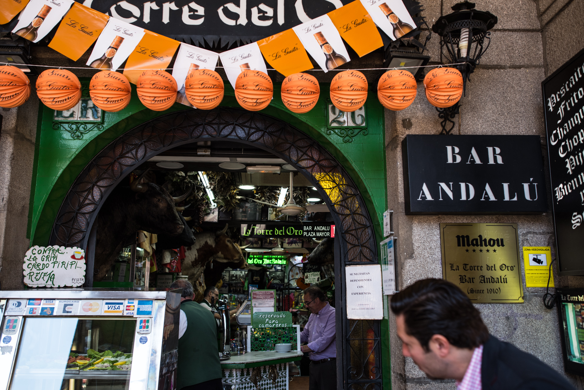 Otro curioso restaurante situado en los soportales de la Plaza Mayor es La Torre del Oro o Bar Andalú. Existe desde 1903 y después de pasar por varias generaciones, el actual dueño, lo ha decorado con motivos taurinos. La carta recoge lo más típico de la cocina andaluza: 'pescaíto' frito, calamares a la andaluza o huevos rotos.