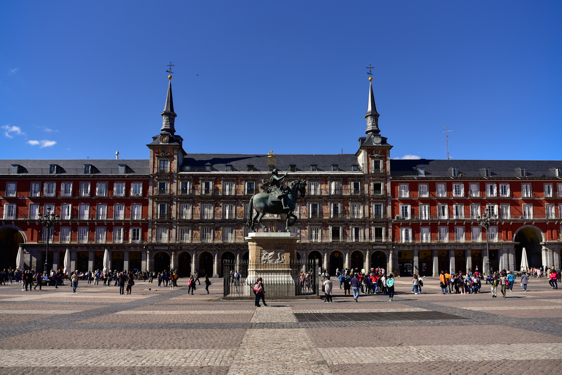 Una vista general de la Plaza Mayor de Madrid con la estatua de Felipe III en el centro y de fondo la Casa de la Panadería.