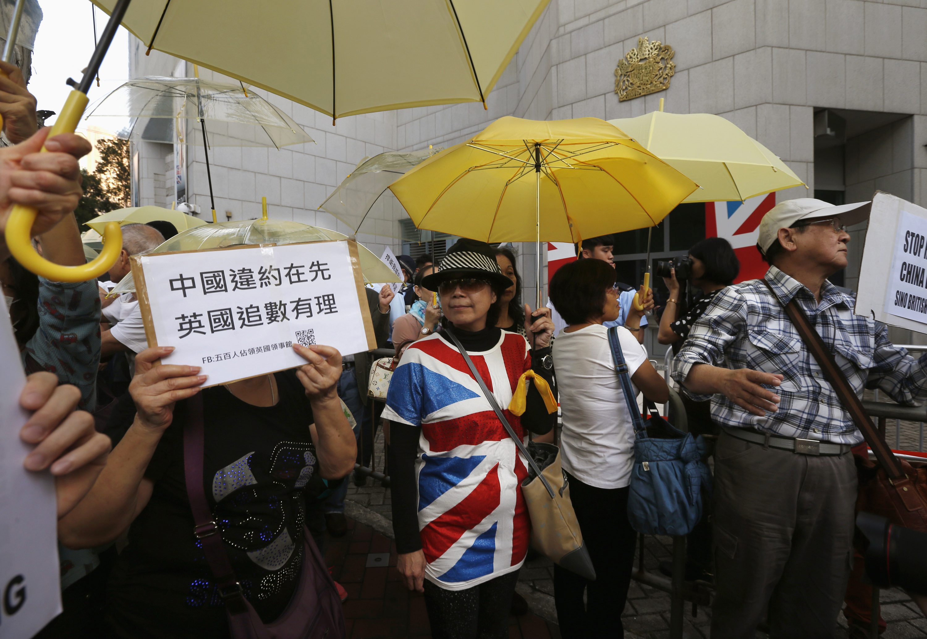 21 de noviembre de 2014. Varios manifestantes a favor de la democracia, portando paraguas amarillos, un símbolo del movimiento de la desobediencia civil. La protesta se produjo a las puertas del consulado británico en Hong Kong.