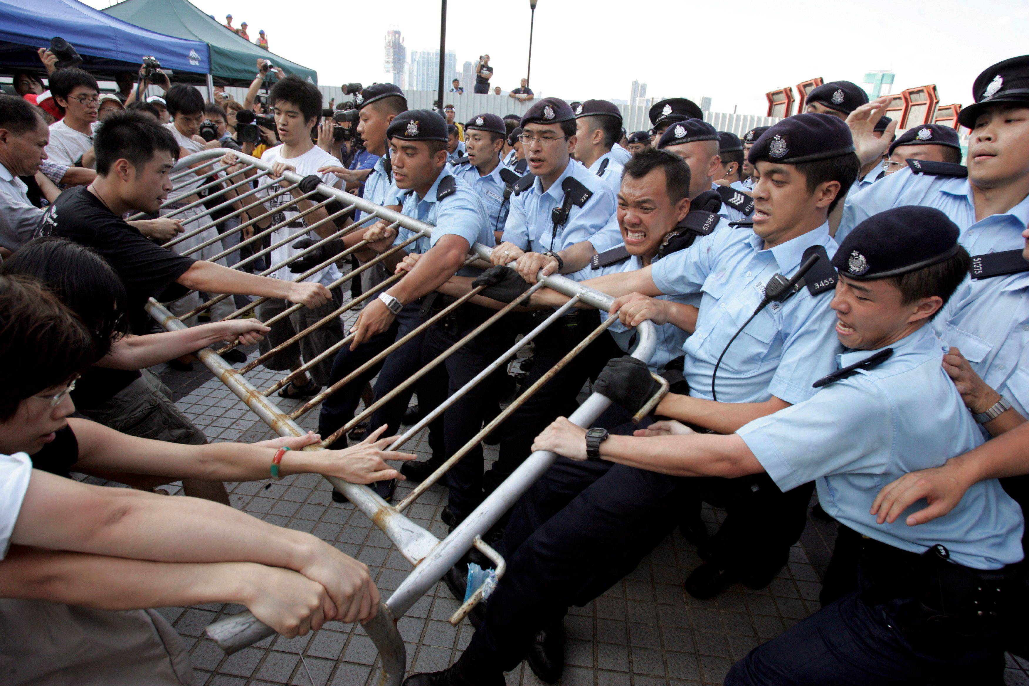 1 agosto de 2007 - Decenas de manifestantes lucharon por salvar Muelle de la Reina en el distrito financiero de Hong Kong. El muelle de la época colonial en el corazón financiero de la ciudad se convirtió en un campo de batalla cívica en el año 2007. El gobierno quería que reformara, lo que enfureció a los activistas que lucharon para salvar lo que veían como un sitio histórico. Fue demolido en 2008.