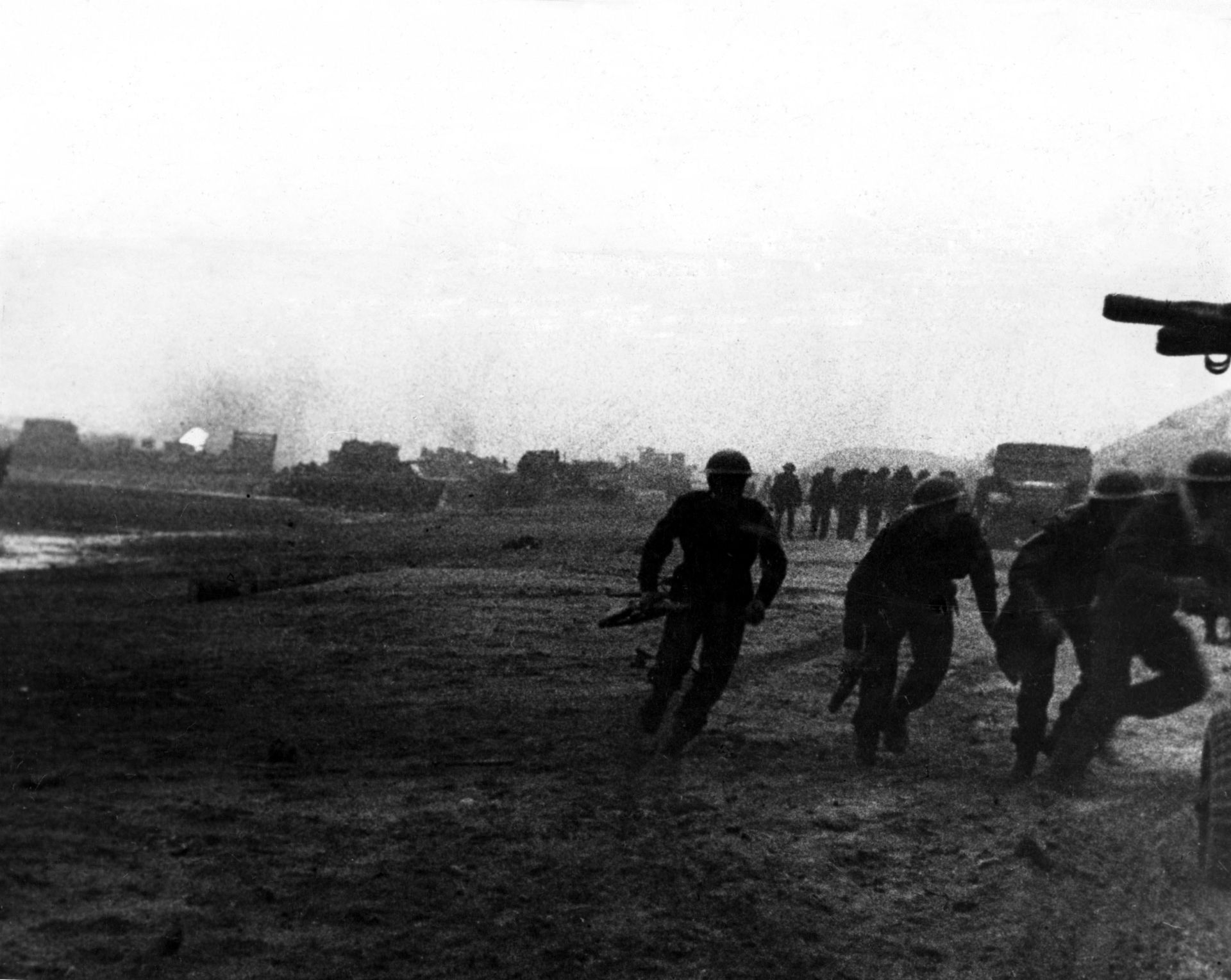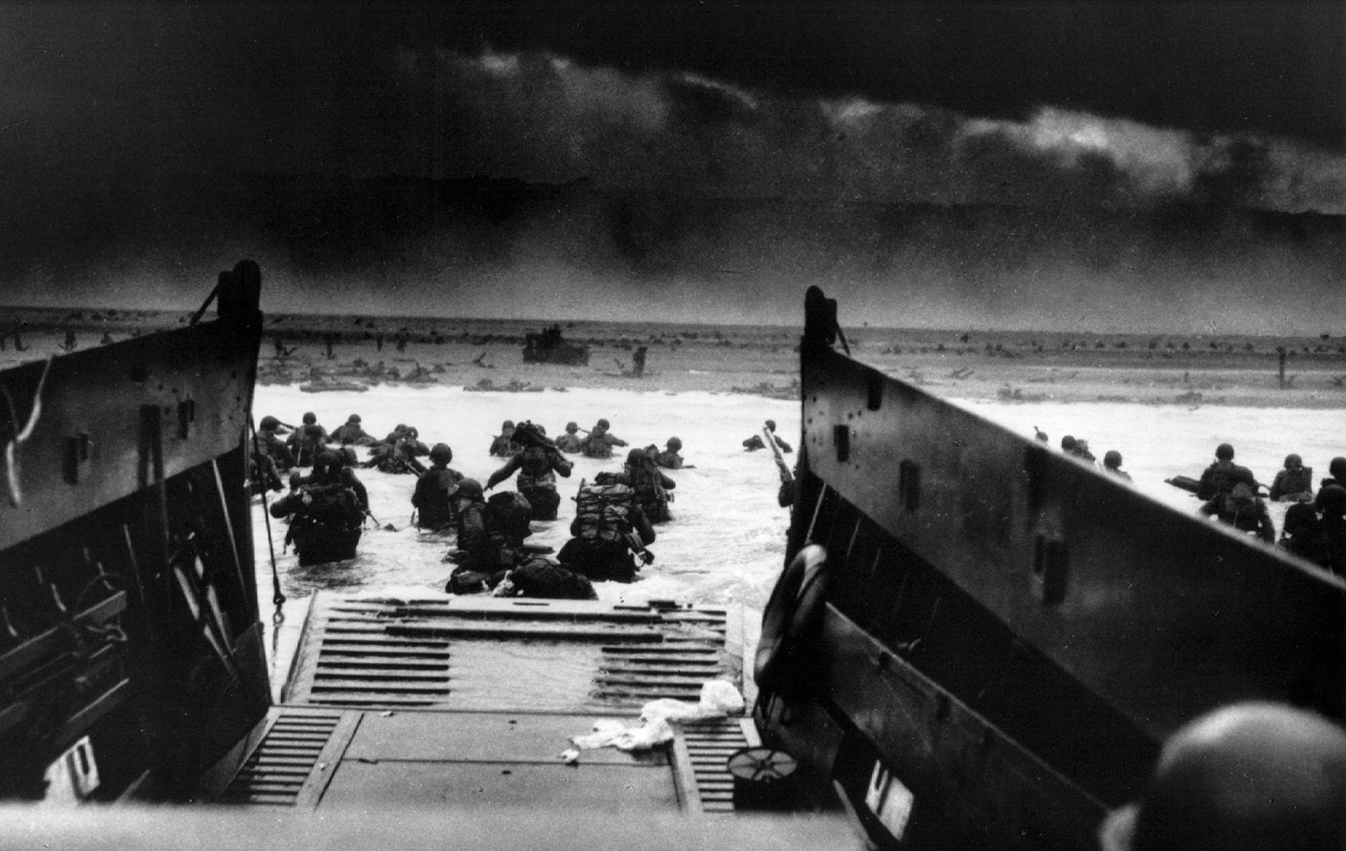 A bordo de una barcaza, frente a la playa de Omaha ante un cielo plomizo y con el mar agitado, decenas de soldados se preparan para el desembarco.