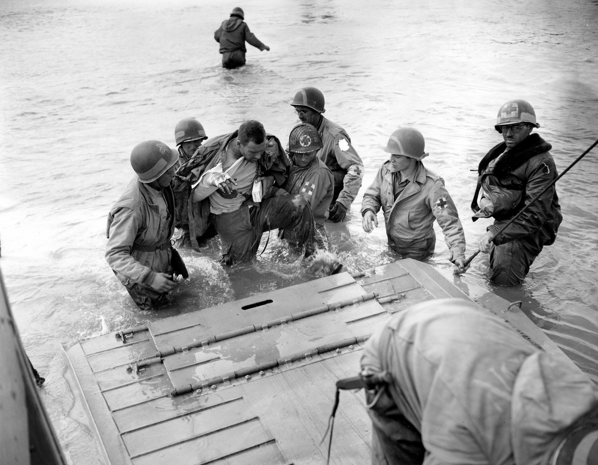 Varios soldados ayudan a un paracaidista herido en la playa de Utah.