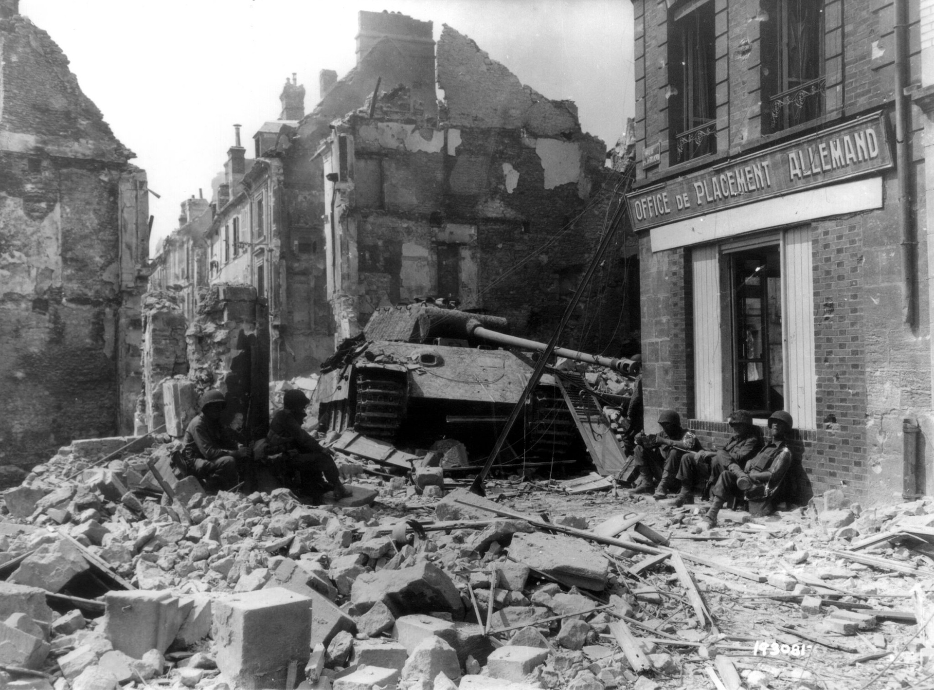 Un grupo de soldados americanos esperan sentados al lado de un carro blindado alemán, en la localidad francesa de Argentan.