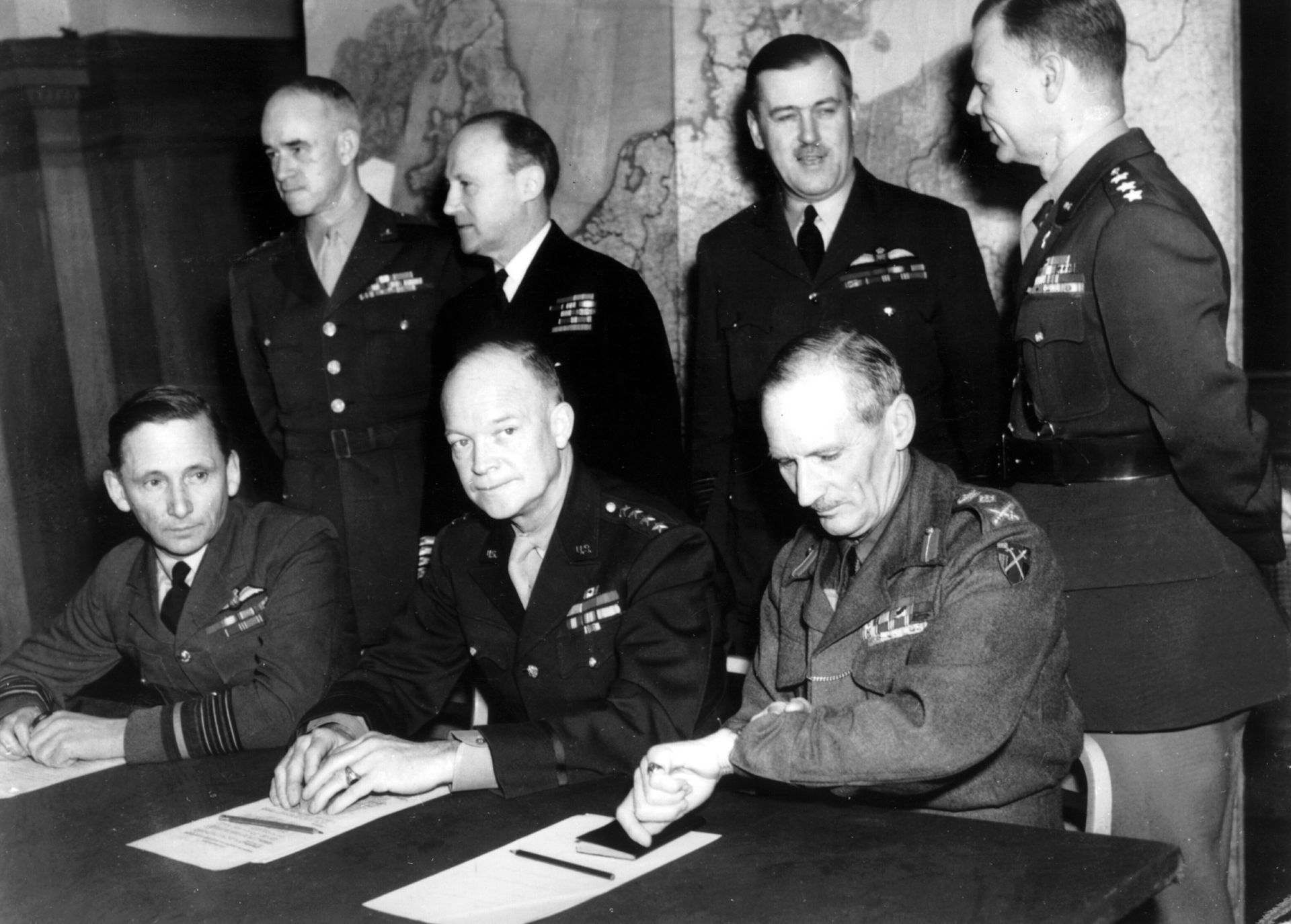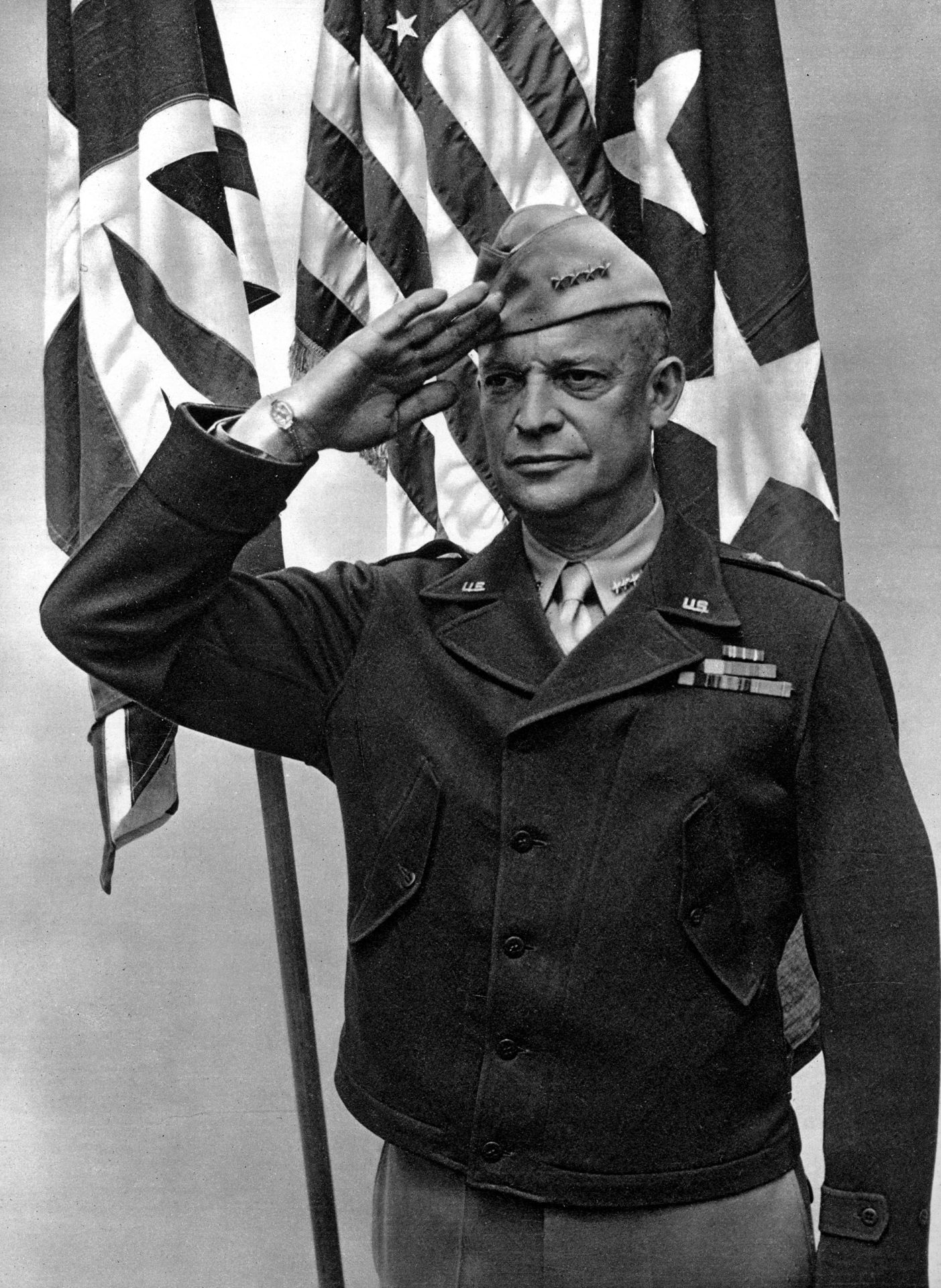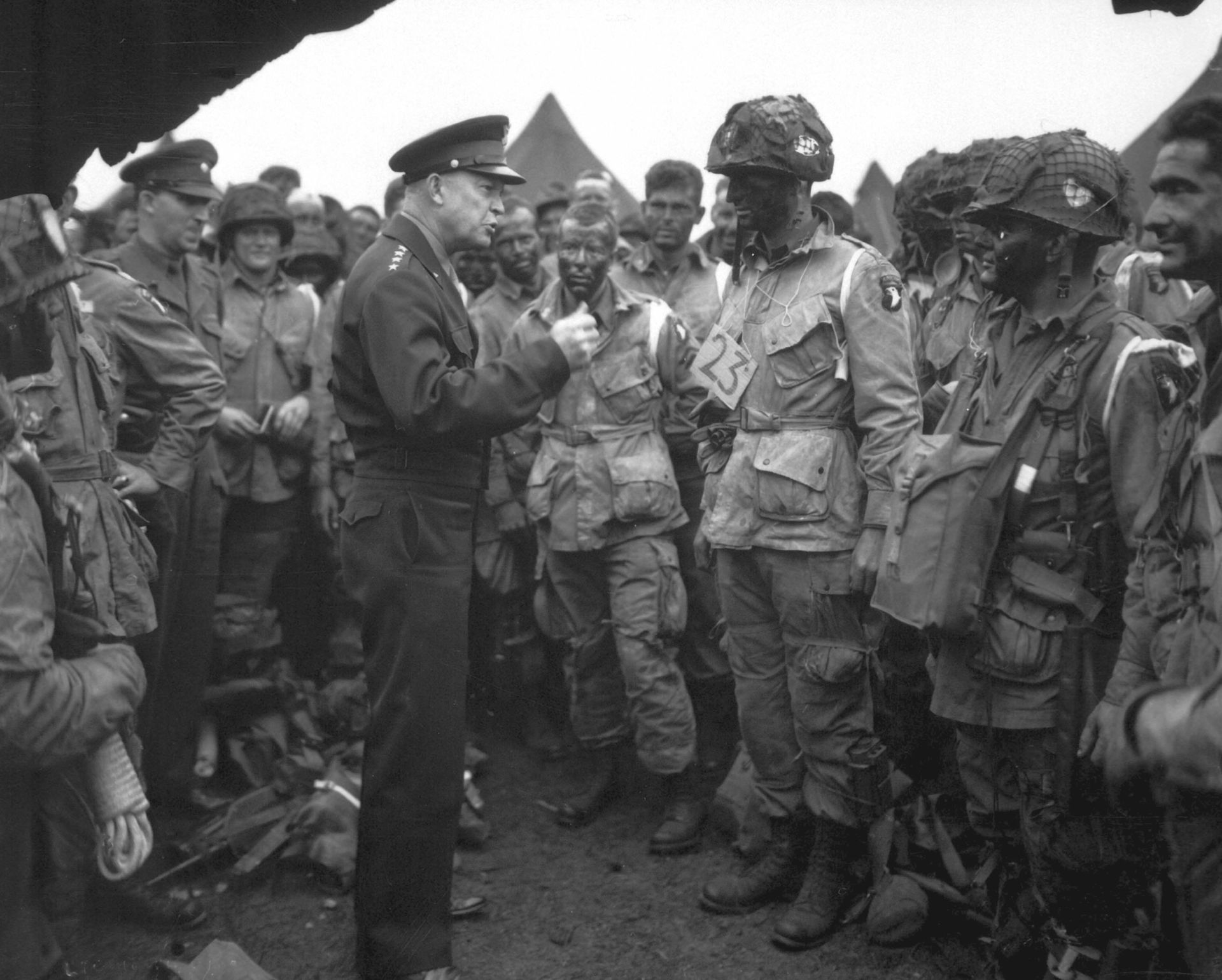 Fotografía tomada el 5 de junio de 1944, en un campo de aviación donde varios soldados de la División 101 Aerotransportada de Estados Unidos, rodean el general Eisenhower.