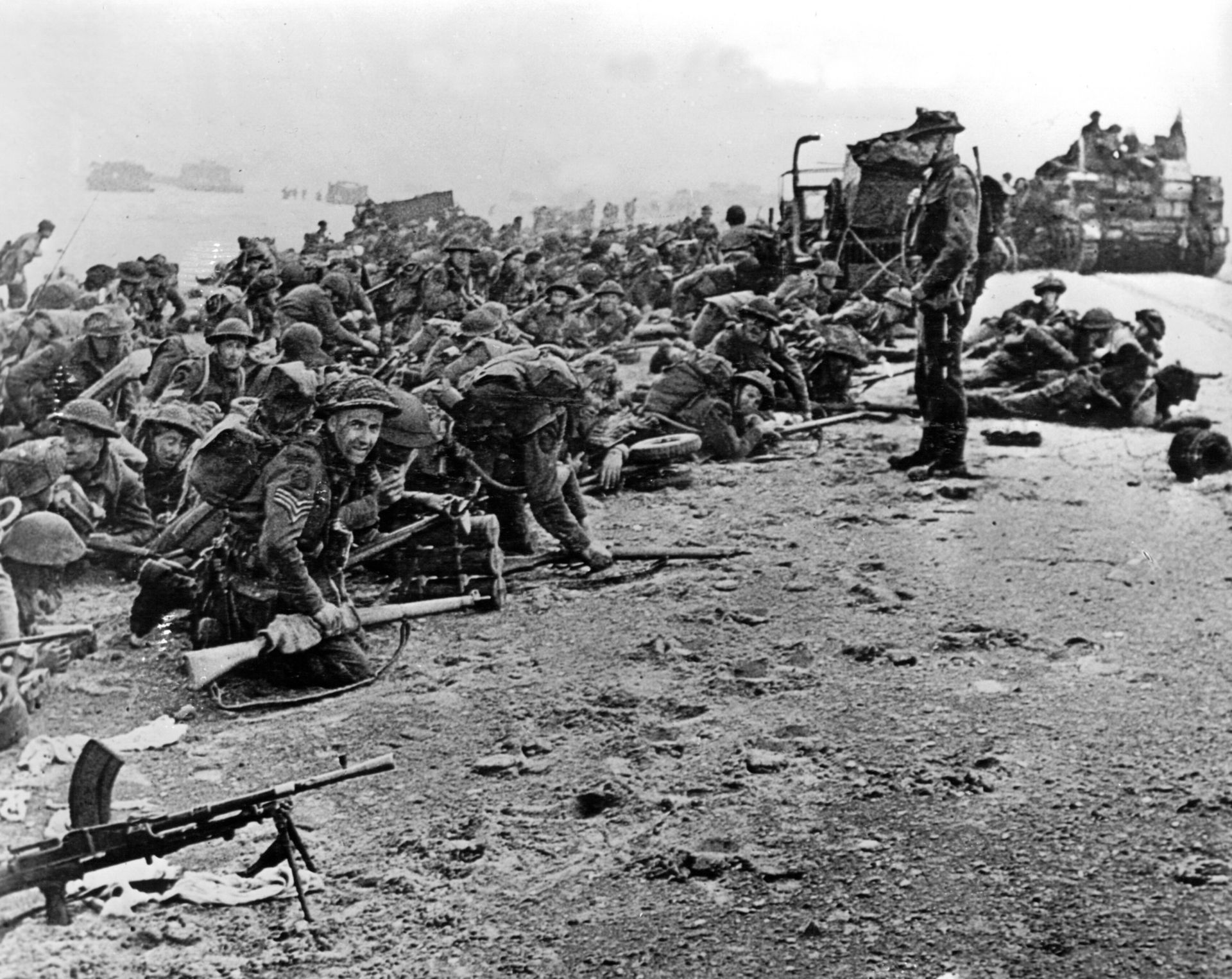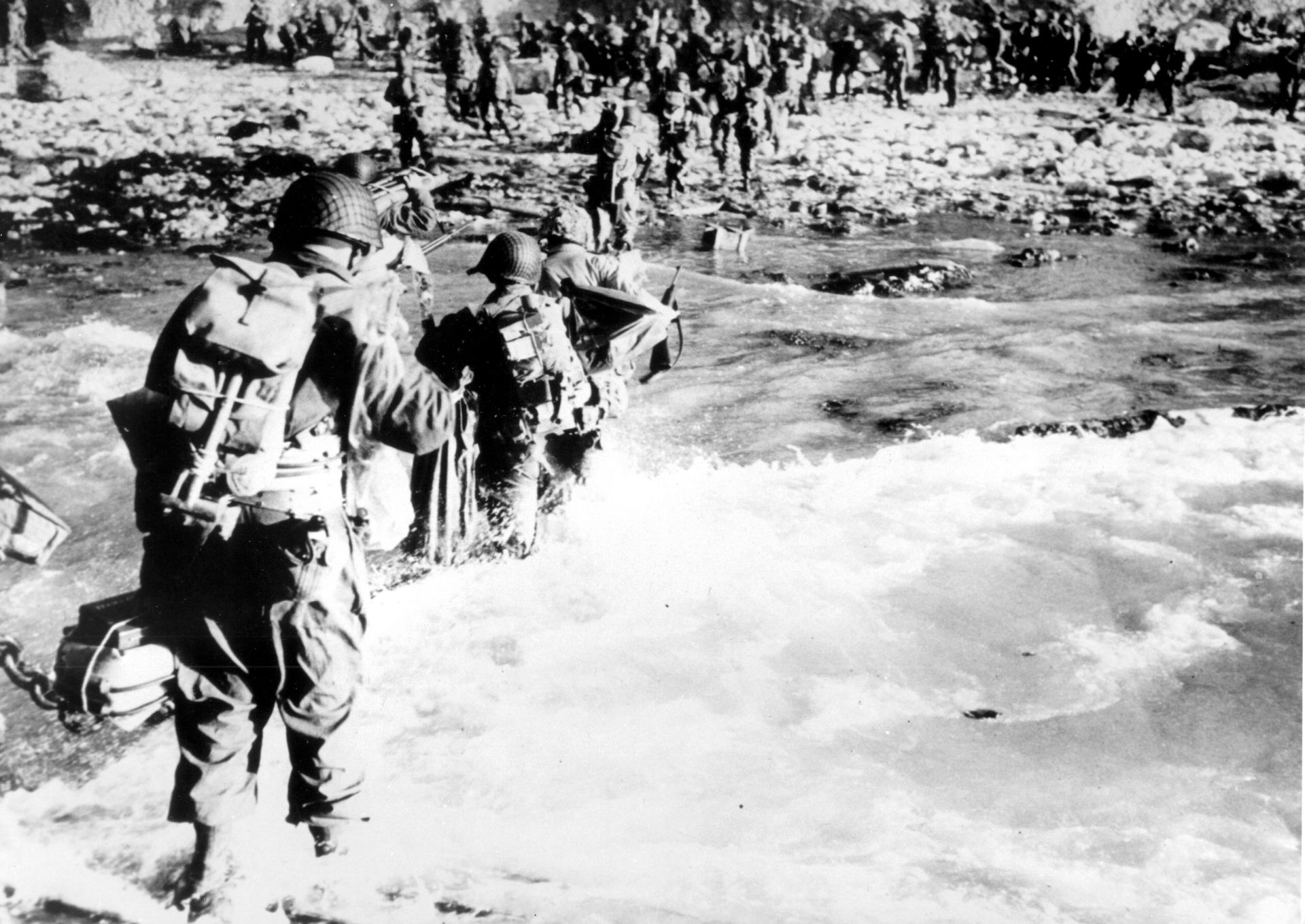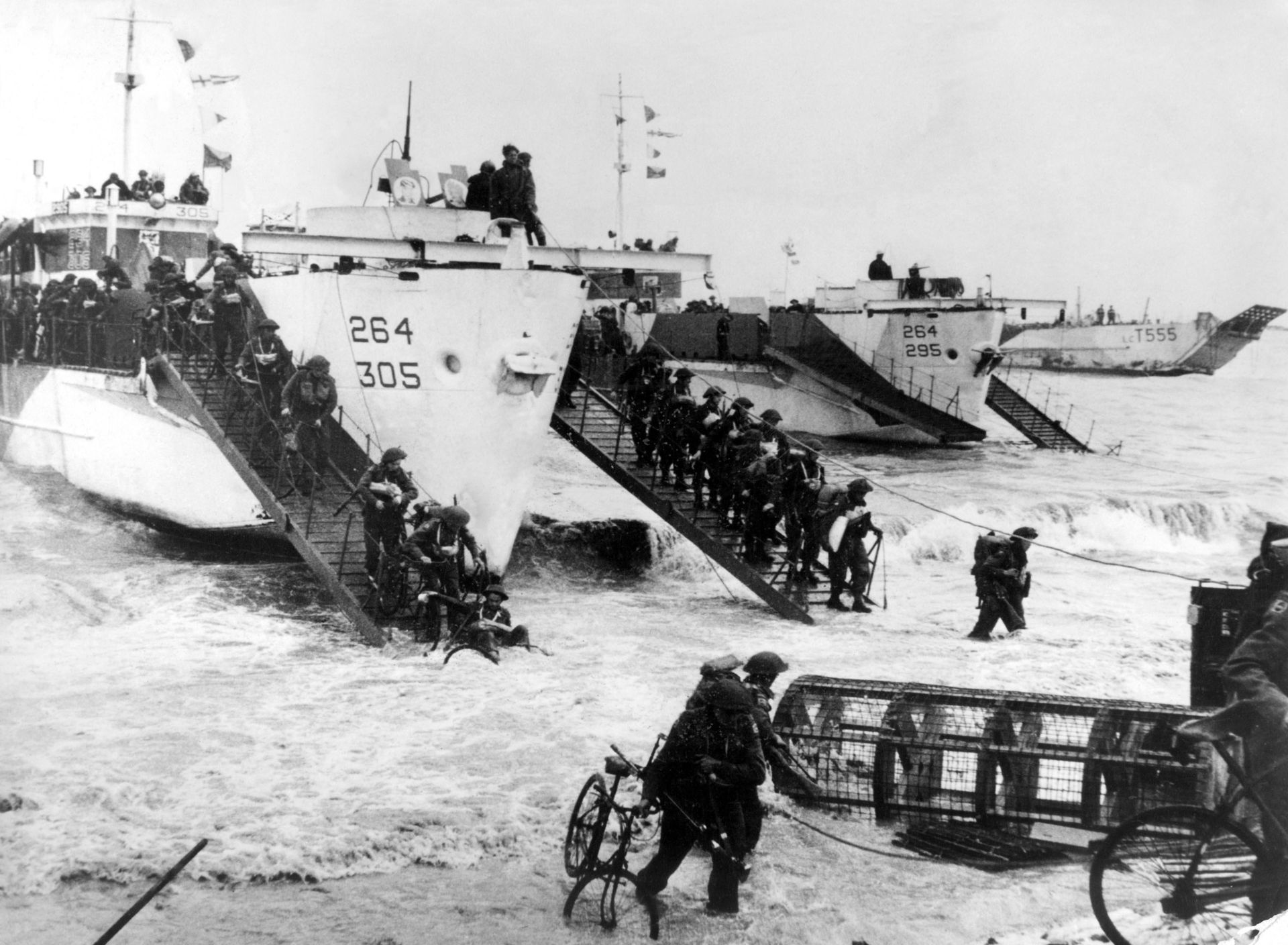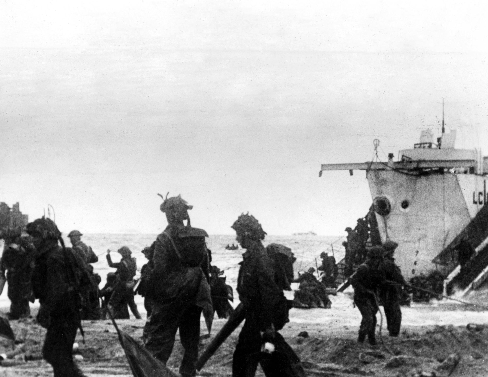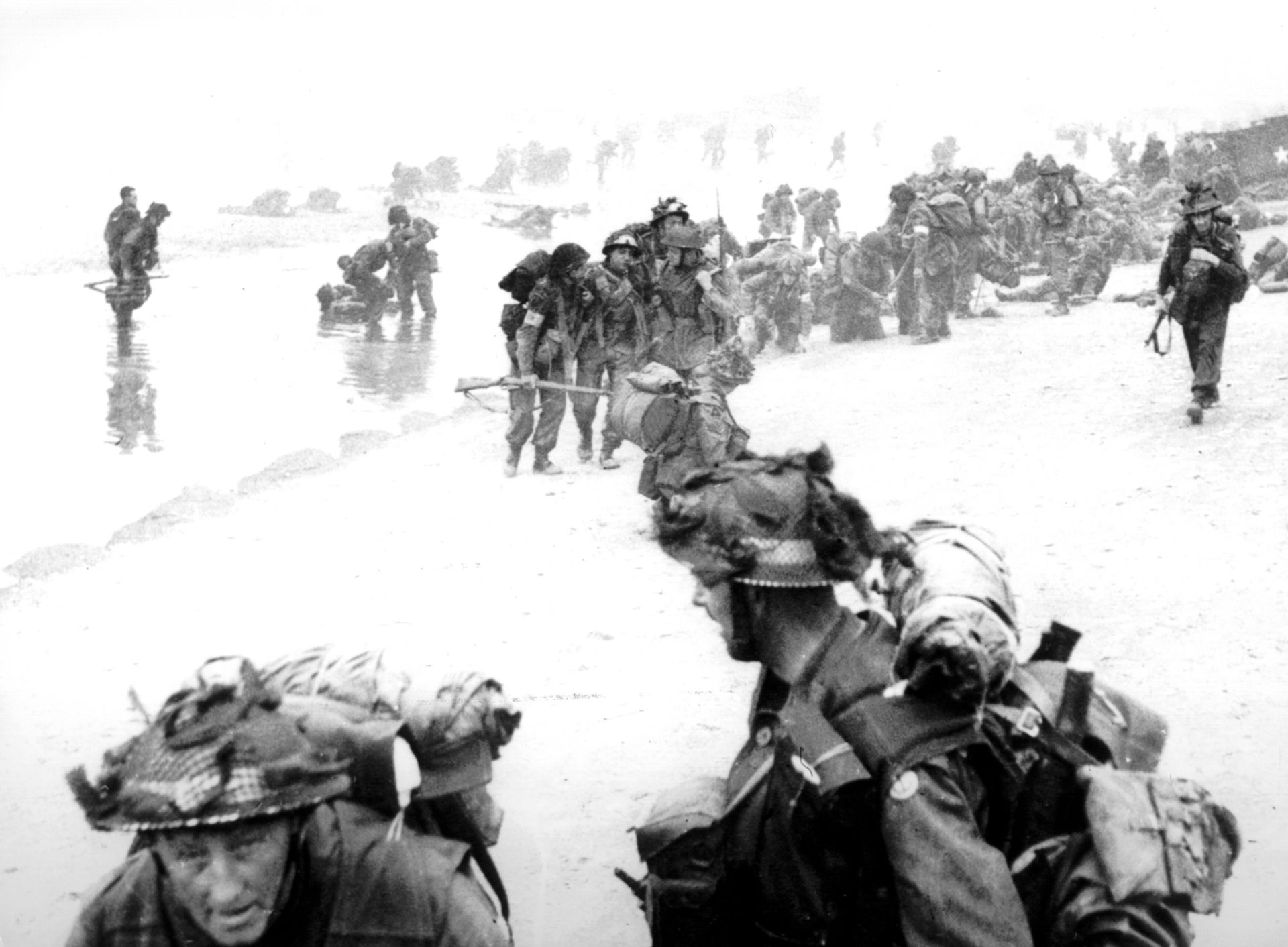 Soldados zapadores del 37º Batallón de Ingenieros de Combate de la quinta brigada especial de ingenieros desembarcando el 6 de junio.